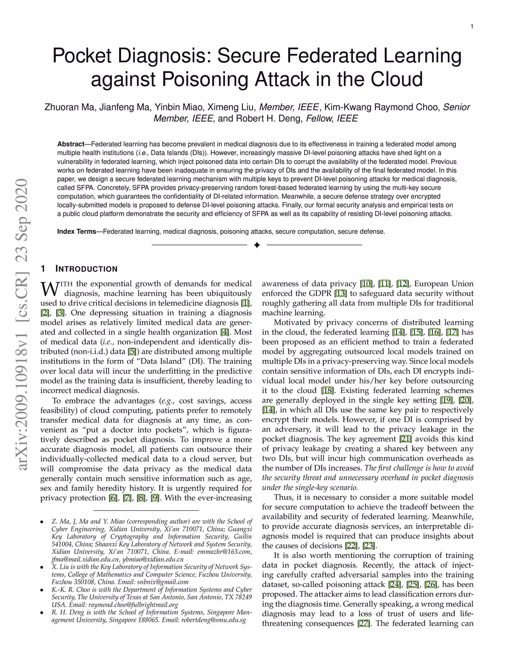 Federated learning has become prevalent in medical diagnosis due to its effectiveness in training a federated model among multiple health institutions (i.e. Data Islands (DIs)). However, increasingly massive DI-level poisoning attacks have shed light on a vulnerability in federated learning, which inject poisoned data into certain DIs to corrupt the availability of the federated model. Previous works on federated learning have been inadequate in ensuring the privacy of DIs and the availability of the final federated model. In this paper, we design a secure federated learning mechanism with multiple keys to prevent DI-level poisoning attacks for medical diagnosis, called SFPA. Concretely, SFPA provides privacy-preserving random forest-based federated learning by using the multi-key secure computation, which guarantees the confidentiality of DI-related information. Meanwhile, a secure defense strategy over encrypted locally-submitted models is proposed to defense DI-level poisoning attacks. Finally, our formal security analysis and empirical tests on a public cloud platform demonstrate the security and efficiency of SFPA as well as its capability of resisting DI-level poisoning attacks.
