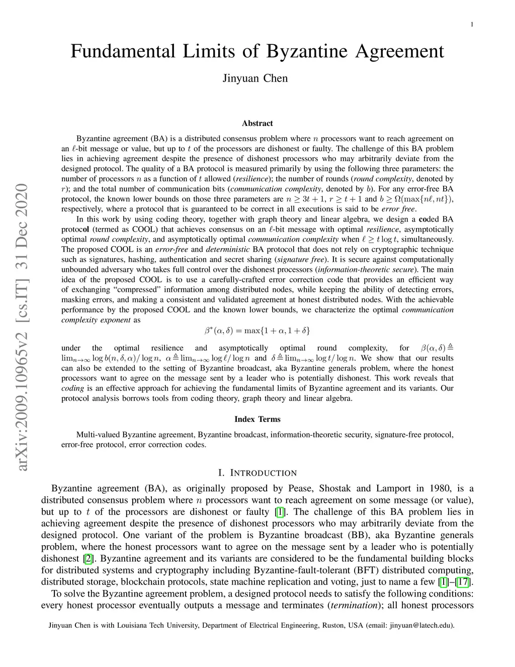 Byzantine agreement (BA) is a distributed consensus problem where processors want to reach agreement on an -bit message or value, but up to of the processors are dishonest or faulty. The challenge of this BA problem lies in achieving agreement despite the presence of dishonest processors who may arbitrarily deviate from the designed protocol. The quality of a BA protocol is measured primarily by using the following three parameters: the number of processors as a function of allowed (resilience); the number of rounds (round complexity, denoted by ); and the total number of communication bits (communication complexity, denoted by ). For any error-free BA protocol, the known lower bounds on those three parameters are , and , respectively, where a protocol that is guaranteed to be correct in all executions is said to be error free. In this work by using coding theory, together with graph theory and linear algebra, we design a coded BA protocol (termed as COOL) that achieves consensus on an -bit message with optimal resilience, asymptotically optimal round complexity, and asymptotically optimal communication complexity when , simultaneously. The proposed COOL is an error-free and deterministic BA protocol that does not rely on cryptographic technique. It is secure against computationally unbounded adversary. With the achievable performance by the proposed COOL and the known lower bounds, we characterize the optimal communication complexity exponent as \[\beta^*(\alpha,\delta)=\max\{1+\alpha,1+\delta\}\] for , and . This work reveals that coding is an effective approach for achieving the fundamental limits of Byzantine agreement and its variants.
