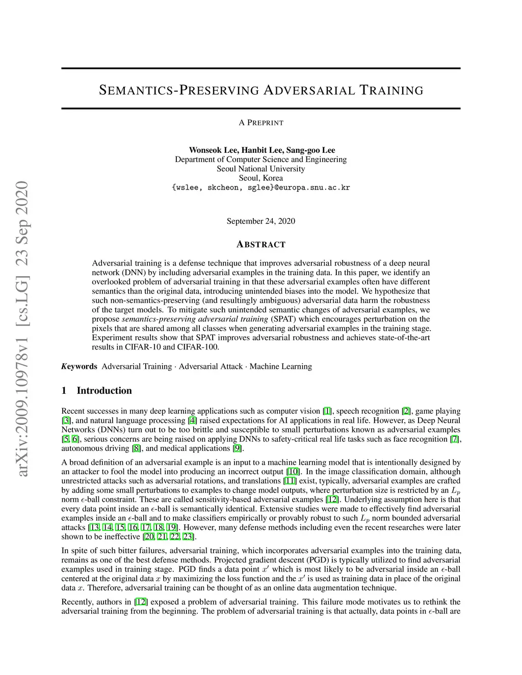 Adversarial training is a defense technique that improves adversarial robustness of a deep neural network (DNN) by including adversarial examples in the training data. In this paper, we identify an overlooked problem of adversarial training in that these adversarial examples often have different semantics than the original data, introducing unintended biases into the model. We hypothesize that such non-semantics-preserving (and resultingly ambiguous) adversarial data harm the robustness of the target models. To mitigate such unintended semantic changes of adversarial examples, we propose semantics-preserving adversarial training (SPAT) which encourages perturbation on the pixels that are shared among all classes when generating adversarial examples in the training stage. Experiment results show that SPAT improves adversarial robustness and achieves state-of-the-art results in CIFAR-10 and CIFAR-100.
