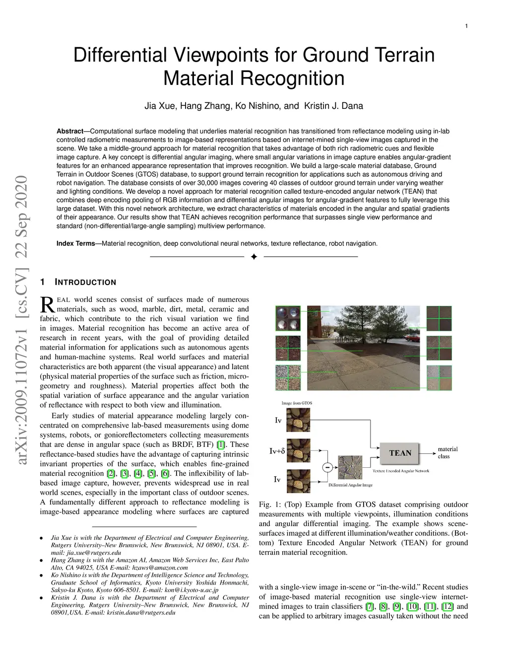 Computational surface modeling that underlies material recognition has transitioned from reflectance modeling using in-lab controlled radiometric measurements to image-based representations based on internet-mined single-view images captured in the scene. We take a middle-ground approach for material recognition that takes advantage of both rich radiometric cues and flexible image capture. A key concept is differential angular imaging, where small angular variations in image capture enables angular-gradient features for an enhanced appearance representation that improves recognition. We build a large-scale material database, Ground Terrain in Outdoor Scenes (GTOS) database, to support ground terrain recognition for applications such as autonomous driving and robot navigation. The database consists of over 30,000 images covering 40 classes of outdoor ground terrain under varying weather and lighting conditions. We develop a novel approach for material recognition called texture-encoded angular network (TEAN) that combines deep encoding pooling of RGB information and differential angular images for angular-gradient features to fully leverage this large dataset. With this novel network architecture, we extract characteristics of materials encoded in the angular and spatial gradients of their appearance. Our results show that TEAN achieves recognition performance that surpasses single view performance and standard (non-differential/large-angle sampling) multiview performance.
