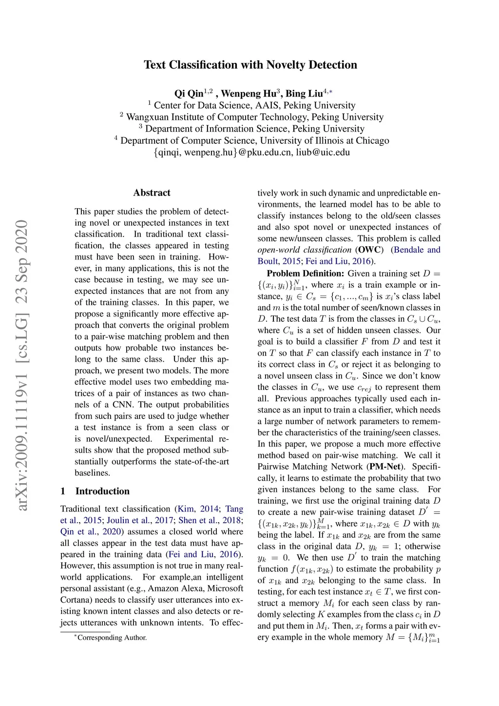 This paper studies the problem of detecting novel or unexpected instances in text classification. In traditional text classification, the classes appeared in testing must have been seen in training. However, in many applications, this is not the case because in testing, we may see unexpected instances that are not from any of the training classes. In this paper, we propose a significantly more effective approach that converts the original problem to a pair-wise matching problem and then outputs how probable two instances belong to the same class. Under this approach, we present two models. The more effective model uses two embedding matrices of a pair of instances as two channels of a CNN. The output probabilities from such pairs are used to judge whether a test instance is from a seen class or is novel/unexpected. Experimental results show that the proposed method substantially outperforms the state-of-the-art baselines.