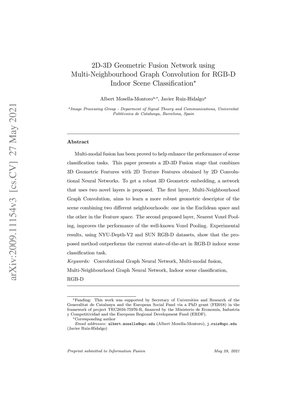 Multi-modal fusion has been proved to help enhance the performance of scene classification tasks. This paper presents a 2D-3D Fusion stage that combines 3D Geometric Features with 2D Texture Features obtained by 2D Convolutional Neural Networks. To get a robust 3D Geometric embedding, a network that uses two novel layers is proposed. The first layer, Multi-Neighbourhood Graph Convolution, aims to learn a more robust geometric descriptor of the scene combining two different neighbourhoods: one in the Euclidean space and the other in the Feature space. The second proposed layer, Nearest Voxel Pooling, improves the performance of the well-known Voxel Pooling. Experimental results, using NYU-Depth-V2 and SUN RGB-D datasets, show that the proposed method outperforms the current state-of-the-art in RGB-D indoor scene classification task.
