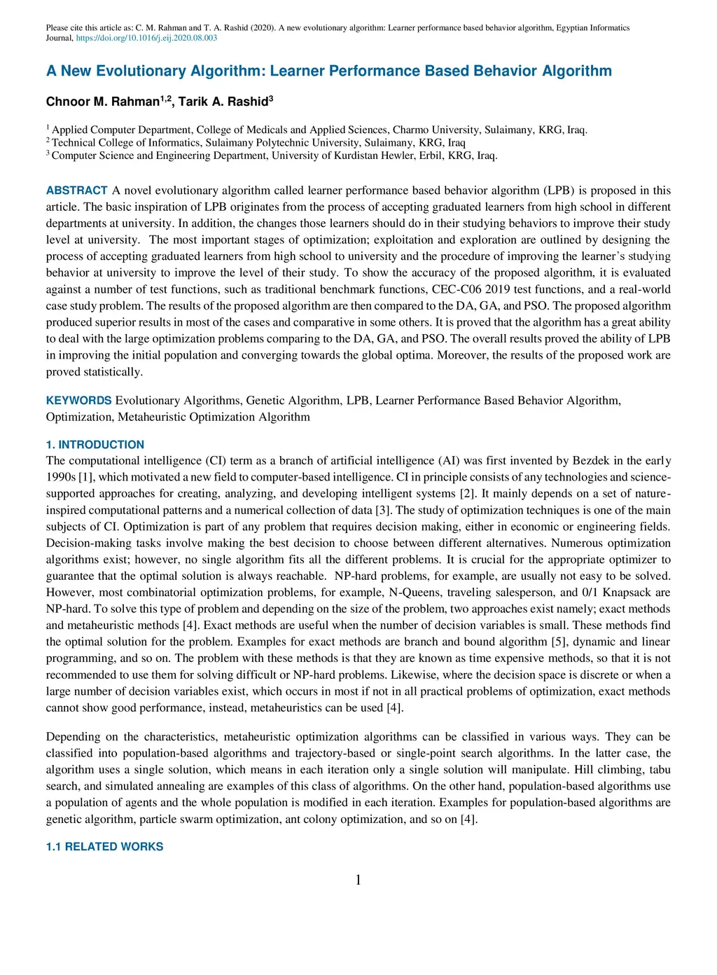 A novel evolutionary algorithm called learner performance based behavior algorithm (LPB) is proposed in this article. The basic inspiration of LPB originates from the process of accepting graduated learners from high school in different departments at university. In addition, the changes those learners should do in their studying behaviors to improve their study level at university. The most important stages of optimization; exploitation and exploration are outlined by designing the process of accepting graduated learners from high school to university and the procedure of improving the learner's studying behavior at university to improve the level of their study. To show the accuracy of the proposed algorithm, it is evaluated against a number of test functions, such as traditional benchmark functions, CEC-C06 2019 test functions, and a real-world case study problem. The results of the proposed algorithm are then compared to the DA, GA, and PSO. The proposed algorithm produced superior results in most of the cases and comparative in some others. It is proved that the algorithm has a great ability to deal with the large optimization problems comparing to the DA, GA, and PSO. The overall results proved the ability of LPB in improving the initial population and converging towards the global optima. Moreover, the results of the proposed work are proved statistically.