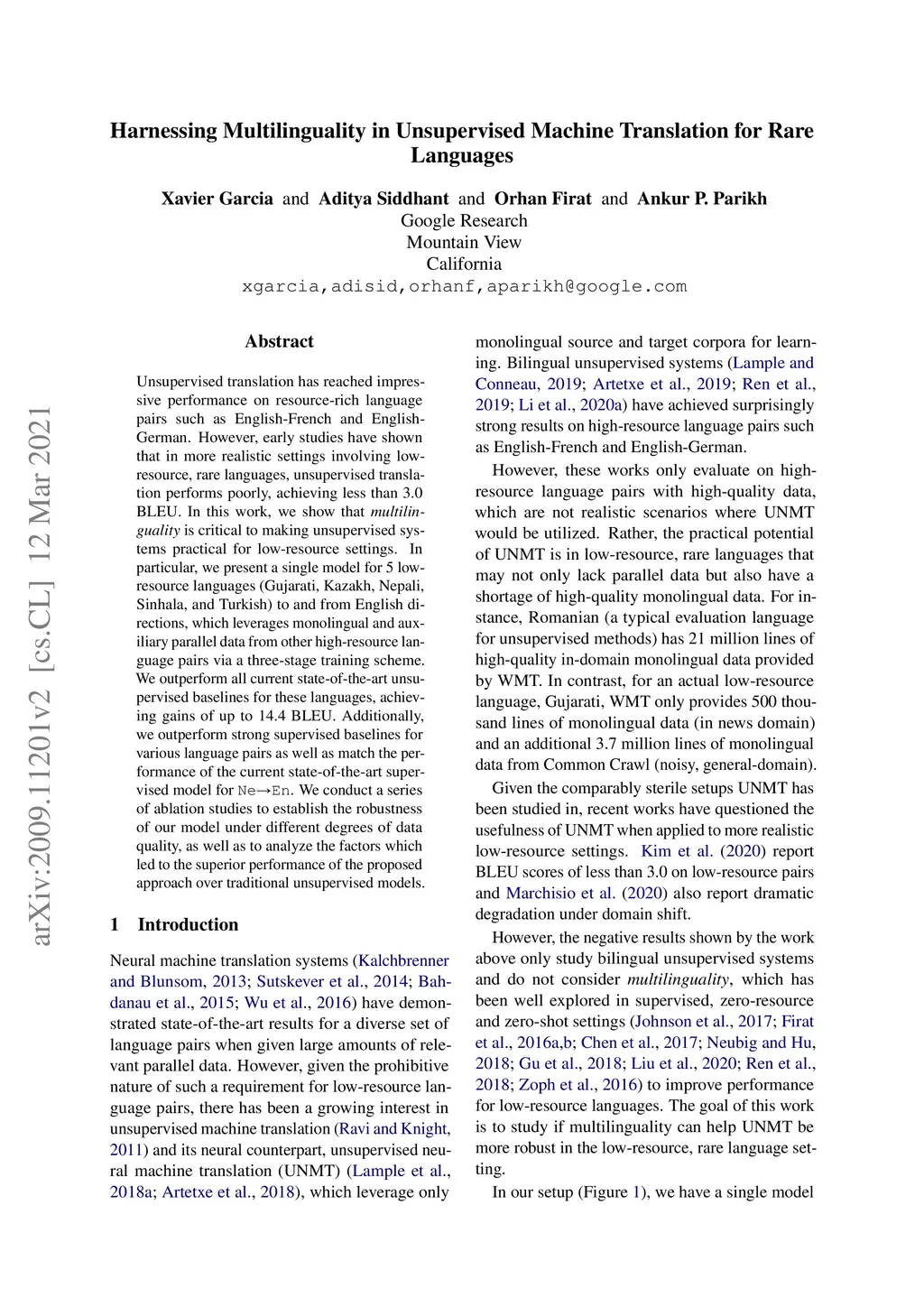 Unsupervised translation has reached impressive performance on resource-rich language pairs such as English-French and English-German. However, early studies have shown that in more realistic settings involving low-resource, rare languages, unsupervised translation performs poorly, achieving less than 3.0 BLEU. In this work, we show that multilinguality is critical to making unsupervised systems practical for low-resource settings. In particular, we present a single model for 5 low-resource languages (Gujarati, Kazakh, Nepali, Sinhala, and Turkish) to and from English directions, which leverages monolingual and auxiliary parallel data from other high-resource language pairs via a three-stage training scheme. We outperform all current state-of-the-art unsupervised baselines for these languages, achieving gains of up to 14.4 BLEU. Additionally, we outperform a large collection of supervised WMT submissions for various language pairs as well as match the performance of the current state-of-the-art supervised model for Nepali-English. We conduct a series of ablation studies to establish the robustness of our model under different degrees of data quality, as well as to analyze the factors which led to the superior performance of the proposed approach over traditional unsupervised models.
