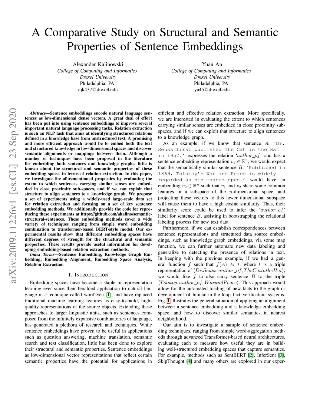 Sentence embeddings encode natural language sentences as low-dimensional dense vectors. A great deal of effort has been put into using sentence embeddings to improve several important natural language processing tasks. Relation extraction is such an NLP task that aims at identifying structured relations defined in a knowledge base from unstructured text. A promising and more efficient approach would be to embed both the text and structured knowledge in low-dimensional spaces and discover semantic alignments or mappings between them. Although a number of techniques have been proposed in the literature for embedding both sentences and knowledge graphs, little is known about the structural and semantic properties of these embedding spaces in terms of relation extraction. In this paper, we investigate the aforementioned properties by evaluating the extent to which sentences carrying similar senses are embedded in close proximity sub-spaces, and if we can exploit that structure to align sentences to a knowledge graph. We propose a set of experiments using a widely-used large-scale data set for relation extraction and focusing on a set of key sentence embedding methods. We additionally provide the code for reproducing these experiments at https://github.com/akalino/semantic-structural-sentences. These embedding methods cover a wide variety of techniques ranging from simple word embedding combination to transformer-based BERT-style model. Our experimental results show that different embedding spaces have different degrees of strength for the structural and semantic properties. These results provide useful information for developing embedding-based relation extraction methods.