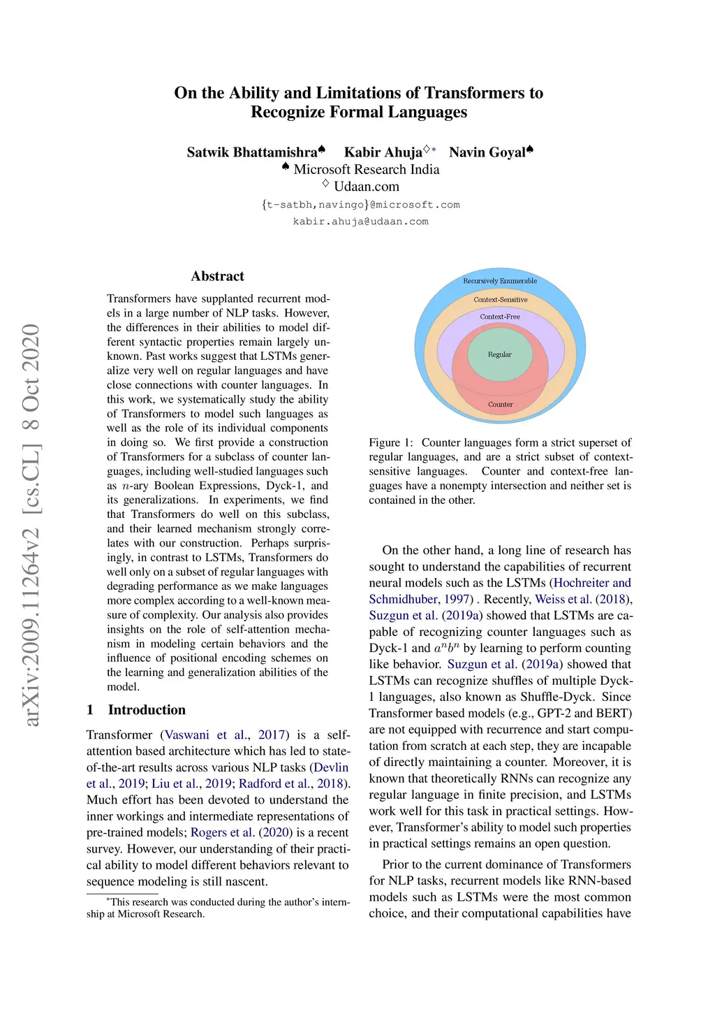 Transformers have supplanted recurrent models in a large number of NLP tasks. However, the differences in their abilities to model different syntactic properties remain largely unknown. Past works suggest that LSTMs generalize very well on regular languages and have close connections with counter languages. In this work, we systematically study the ability of Transformers to model such languages as well as the role of its individual components in doing so. We first provide a construction of Transformers for a subclass of counter languages, including well-studied languages such as n-ary Boolean Expressions, Dyck-1, and its generalizations. In experiments, we find that Transformers do well on this subclass, and their learned mechanism strongly correlates with our construction. Perhaps surprisingly, in contrast to LSTMs, Transformers do well only on a subset of regular languages with degrading performance as we make languages more complex according to a well-known measure of complexity. Our analysis also provides insights on the role of self-attention mechanism in modeling certain behavior and the influence of positional encoding schemes on the learning and generalization ability of the model.