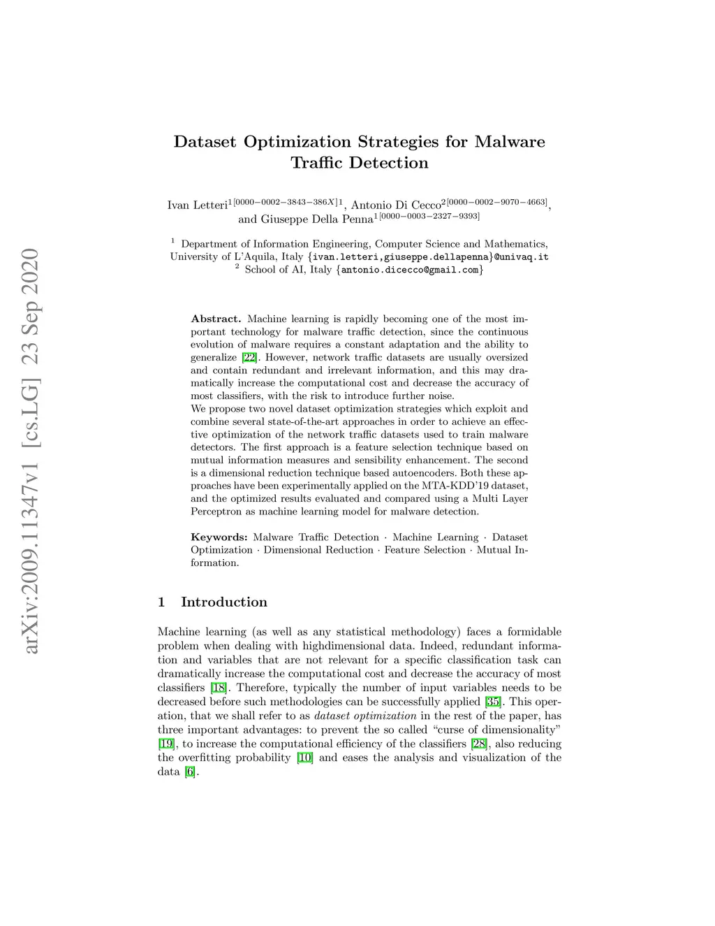 Machine learning is rapidly becoming one of the most important technology for malware traffic detection, since the continuous evolution of malware requires a constant adaptation and the ability to generalize. However, network traffic datasets are usually oversized and contain redundant and irrelevant information, and this may dramatically increase the computational cost and decrease the accuracy of most classifiers, with the risk to introduce further noise. We propose two novel dataset optimization strategies which exploit and combine several state-of-the-art approaches in order to achieve an effective optimization of the network traffic datasets used to train malware detectors. The first approach is a feature selection technique based on mutual information measures and sensibility enhancement. The second is a dimensional reduction technique based autoencoders. Both these approaches have been experimentally applied on the MTA-KDD'19 dataset, and the optimized results evaluated and compared using a Multi Layer Perceptron as machine learning model for malware detection.