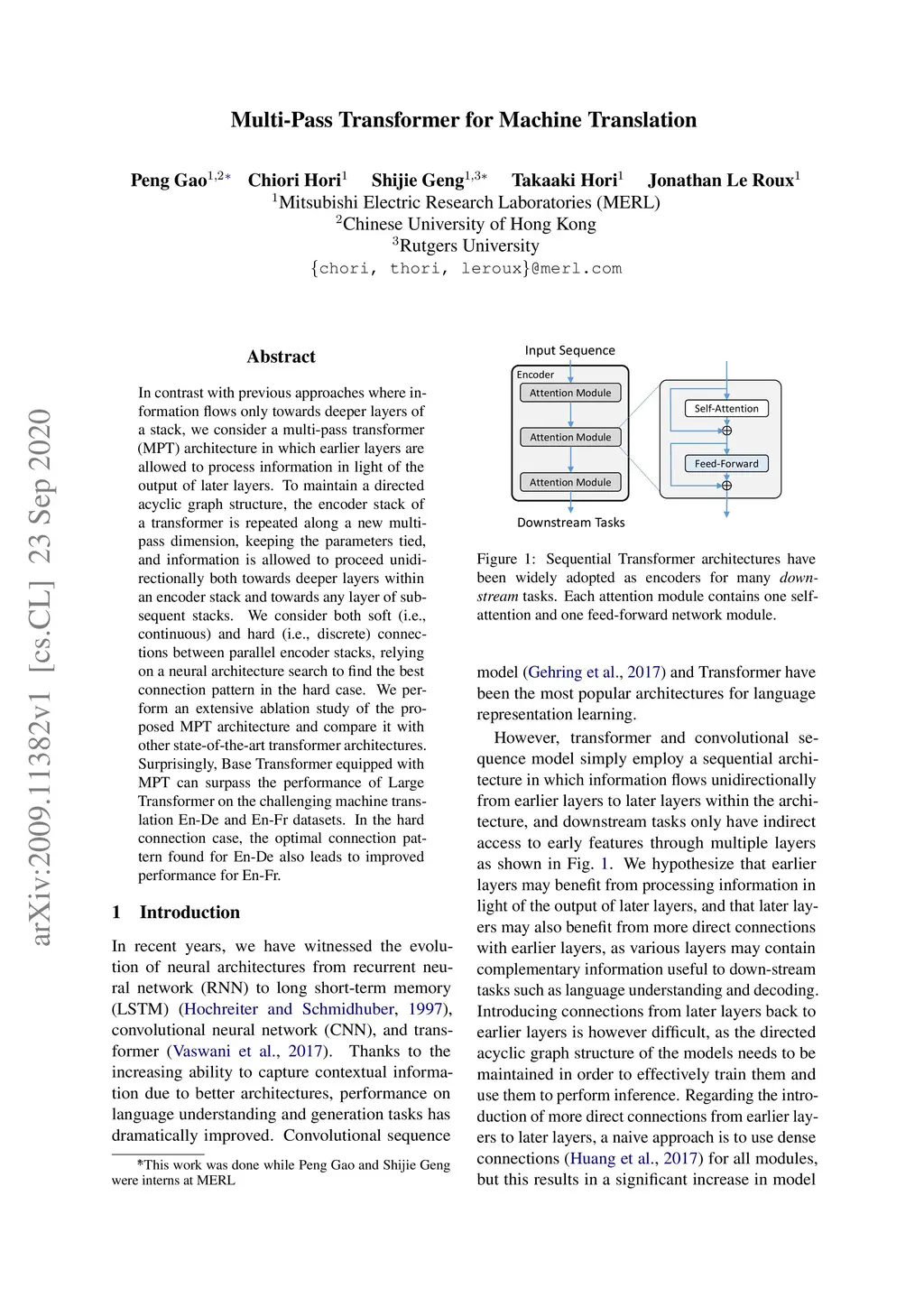In contrast with previous approaches where information flows only towards deeper layers of a stack, we consider a multi-pass transformer (MPT) architecture in which earlier layers are allowed to process information in light of the output of later layers. To maintain a directed acyclic graph structure, the encoder stack of a transformer is repeated along a new multi-pass dimension, keeping the parameters tied, and information is allowed to proceed unidirectionally both towards deeper layers within an encoder stack and towards any layer of subsequent stacks. We consider both soft (i.e., continuous) and hard (i.e., discrete) connections between parallel encoder stacks, relying on a neural architecture search to find the best connection pattern in the hard case. We perform an extensive ablation study of the proposed MPT architecture and compare it with other state-of-the-art transformer architectures. Surprisingly, Base Transformer equipped with MPT can surpass the performance of Large Transformer on the challenging machine translation En-De and En-Fr datasets. In the hard connection case, the optimal connection pattern found for En-De also leads to improved performance for En-Fr.
