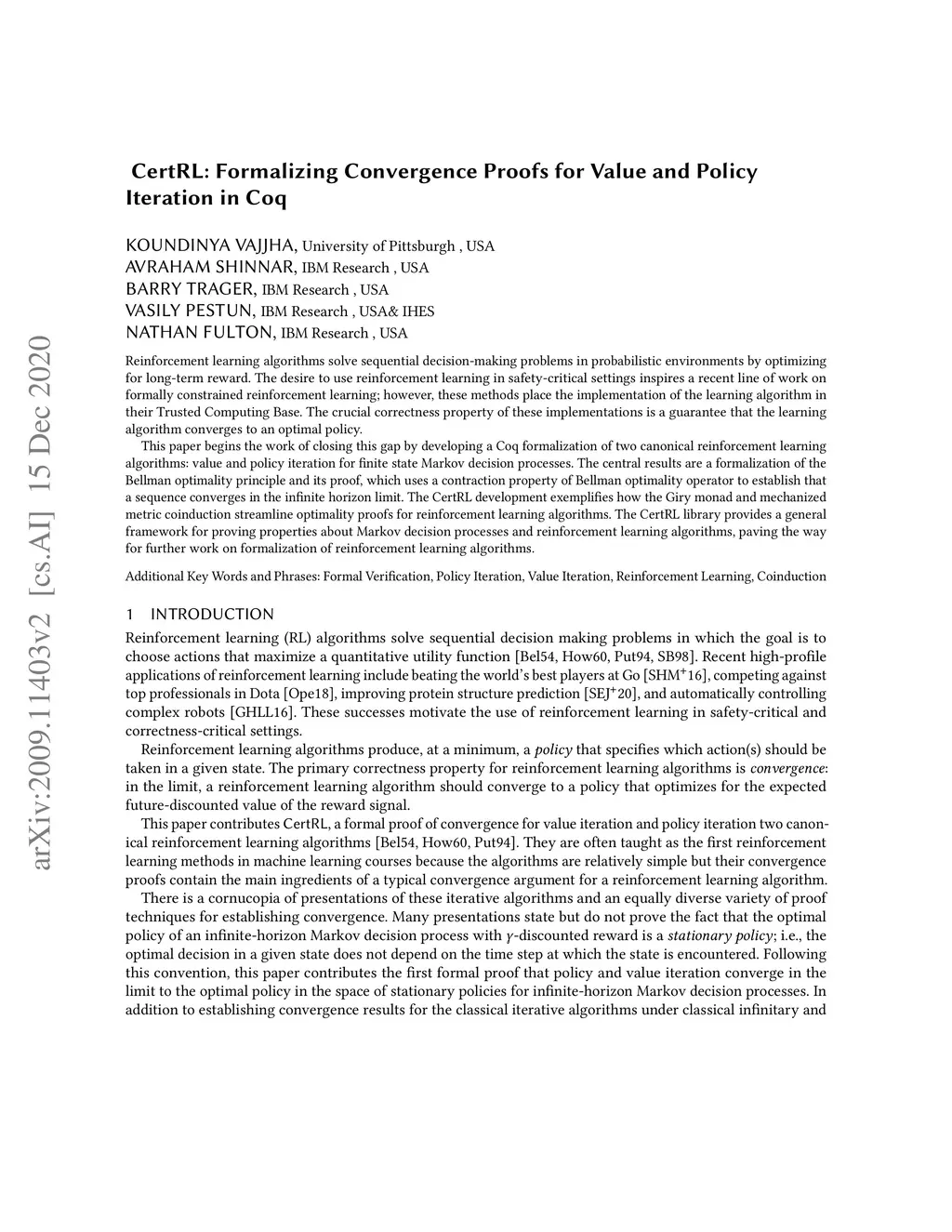 Reinforcement learning algorithms solve sequential decision-making problems in probabilistic environments by optimizing for long-term reward. The desire to use reinforcement learning in safety-critical settings inspires a recent line of work on formally constrained reinforcement learning; however, these methods place the implementation of the learning algorithm in their Trusted Computing Base. The crucial correctness property of these implementations is a guarantee that the learning algorithm converges to an optimal policy. This paper begins the work of closing this gap by developing a Coq formalization of two canonical reinforcement learning algorithms: value and policy iteration for finite state Markov decision processes. The central results are a formalization of Bellman's optimality principle and its proof, which uses a contraction property of Bellman optimality operator to establish that a sequence converges in the infinite horizon limit. The CertRL development exemplifies how the Giry monad and mechanized metric coinduction streamline optimality proofs for reinforcement learning algorithms. The CertRL library provides a general framework for proving properties about Markov decision processes and reinforcement learning algorithms, paving the way for further work on formalization of reinforcement learning algorithms.