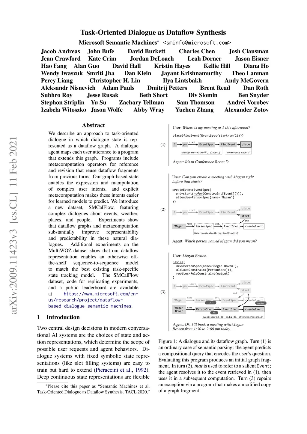 We describe an approach to task-oriented dialogue in which dialogue state is represented as a dataflow graph. A dialogue agent maps each user utterance to a program that extends this graph. Programs include metacomputation operators for reference and revision that reuse dataflow fragments from previous turns. Our graph-based state enables the expression and manipulation of complex user intents, and explicit metacomputation makes these intents easier for learned models to predict. We introduce a new dataset, SMCalFlow, featuring complex dialogues about events, weather, places, and people. Experiments show that dataflow graphs and metacomputation substantially improve representability and predictability in these natural dialogues. Additional experiments on the MultiWOZ dataset show that our dataflow representation enables an otherwise off-the-shelf sequence-to-sequence model to match the best existing task-specific state tracking model. The SMCalFlow dataset and code for replicating experiments are available at https://www.microsoft.com/en-us/research/project/dataflow-based-dialogue-semantic-machines.