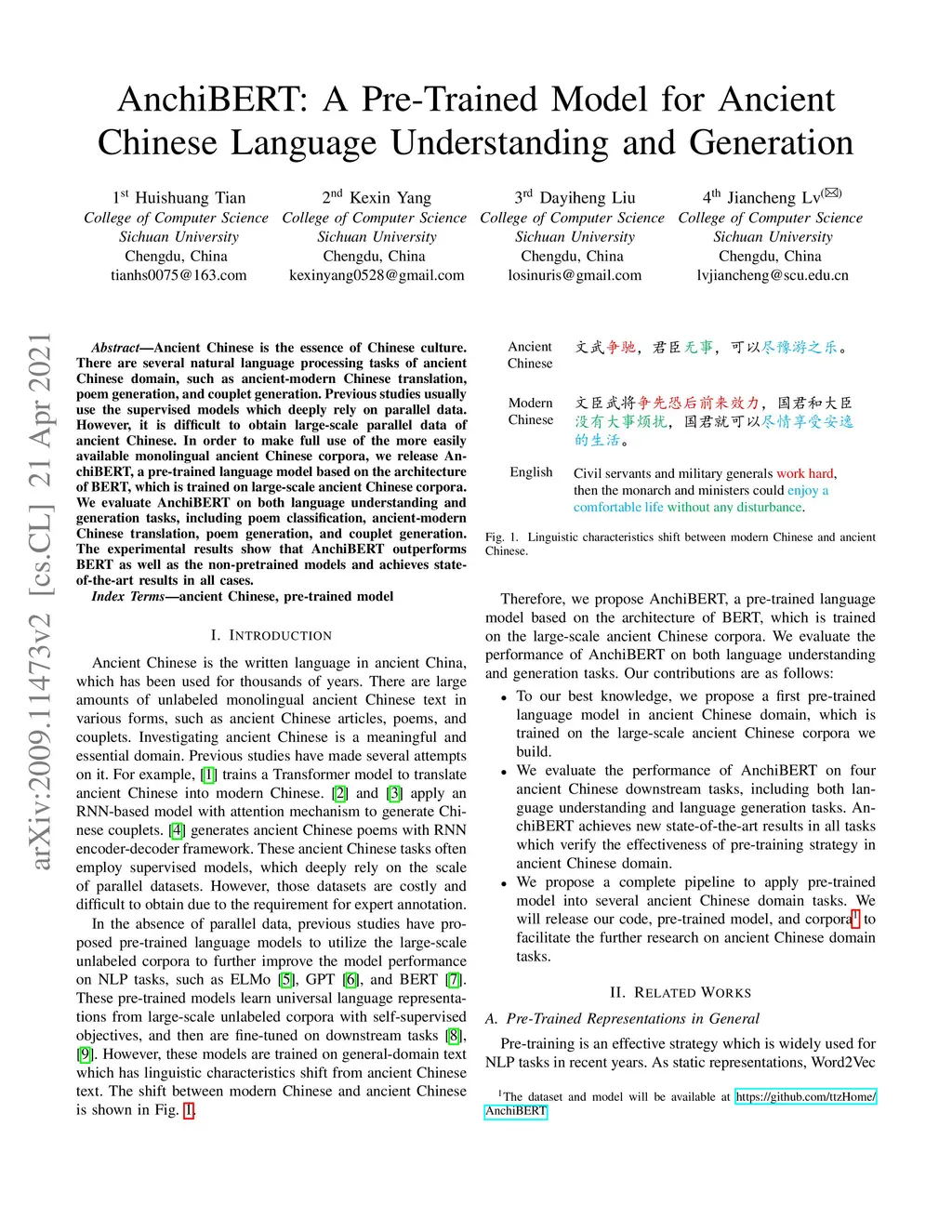 AnchiBERT: A Pre-Trained Model for Ancient ChineseLanguage Understanding