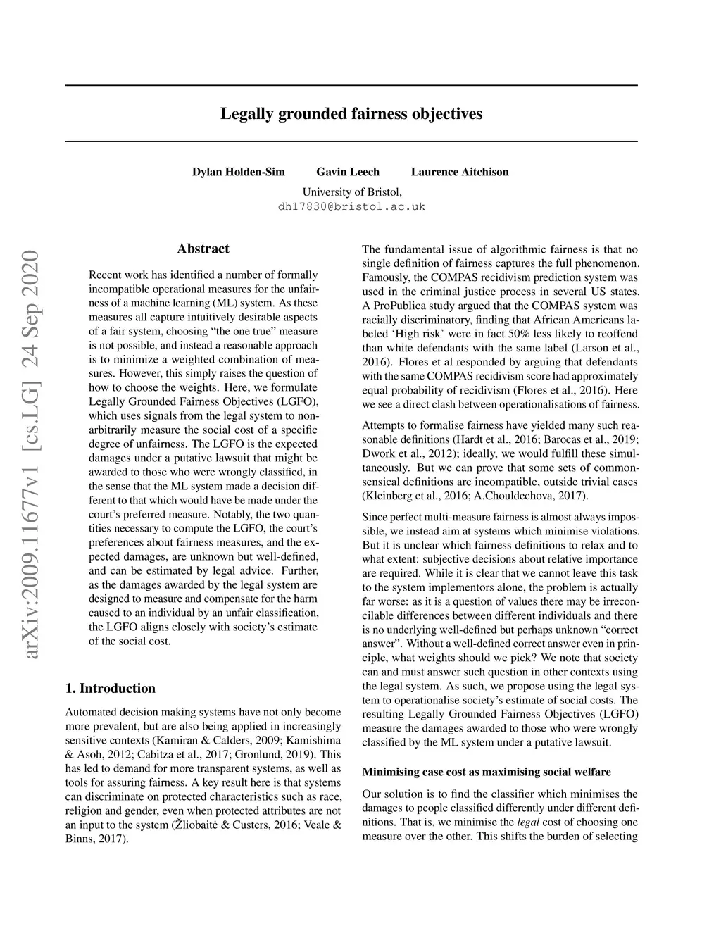 Recent work has identified a number of formally incompatible operational measures for the unfairness of a machine learning (ML) system. As these measures all capture intuitively desirable aspects of a fair system, choosing "the one true" measure is not possible, and instead a reasonable approach is to minimize a weighted combination of measures. However, this simply raises the question of how to choose the weights. Here, we formulate Legally Grounded Fairness Objectives (LGFO), which uses signals from the legal system to non-arbitrarily measure the social cost of a specific degree of unfairness. The LGFO is the expected damages under a putative lawsuit that might be awarded to those who were wrongly classified, in the sense that the ML system made a decision different to that which would have be made under the court's preferred measure. Notably, the two quantities necessary to compute the LGFO, the court's preferences about fairness measures, and the expected damages, are unknown but well-defined, and can be estimated by legal advice. Further, as the damages awarded by the legal system are designed to measure and compensate for the harm caused to an individual by an unfair classification, the LGFO aligns closely with society's estimate of the social cost.