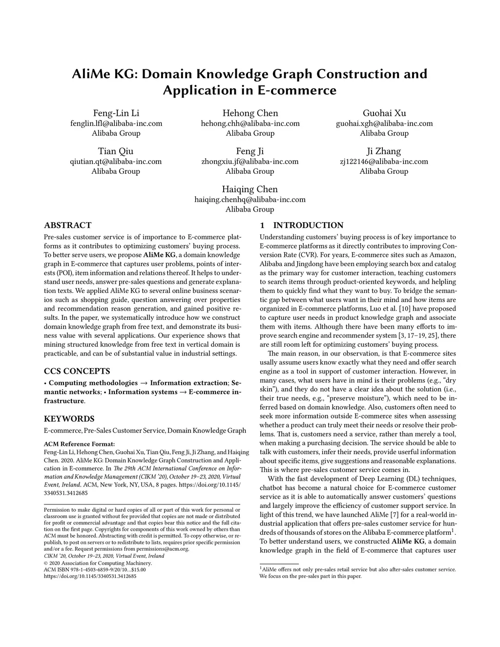 Pre-sales customer service is of importance to E-commerce platforms as it contributes to optimizing customers' buying process. To better serve users, we propose AliMe KG, a domain knowledge graph in E-commerce that captures user problems, points of interests (POI), item information and relations thereof. It helps to understand user needs, answer pre-sales questions and generate explanation texts. We applied AliMe KG to several online business scenarios such as shopping guide, question answering over properties and recommendation reason generation, and gained positive results. In the paper, we systematically introduce how we construct domain knowledge graph from free text, and demonstrate its business value with several applications. Our experience shows that mining structured knowledge from free text in vertical domain is practicable, and can be of substantial value in industrial settings.