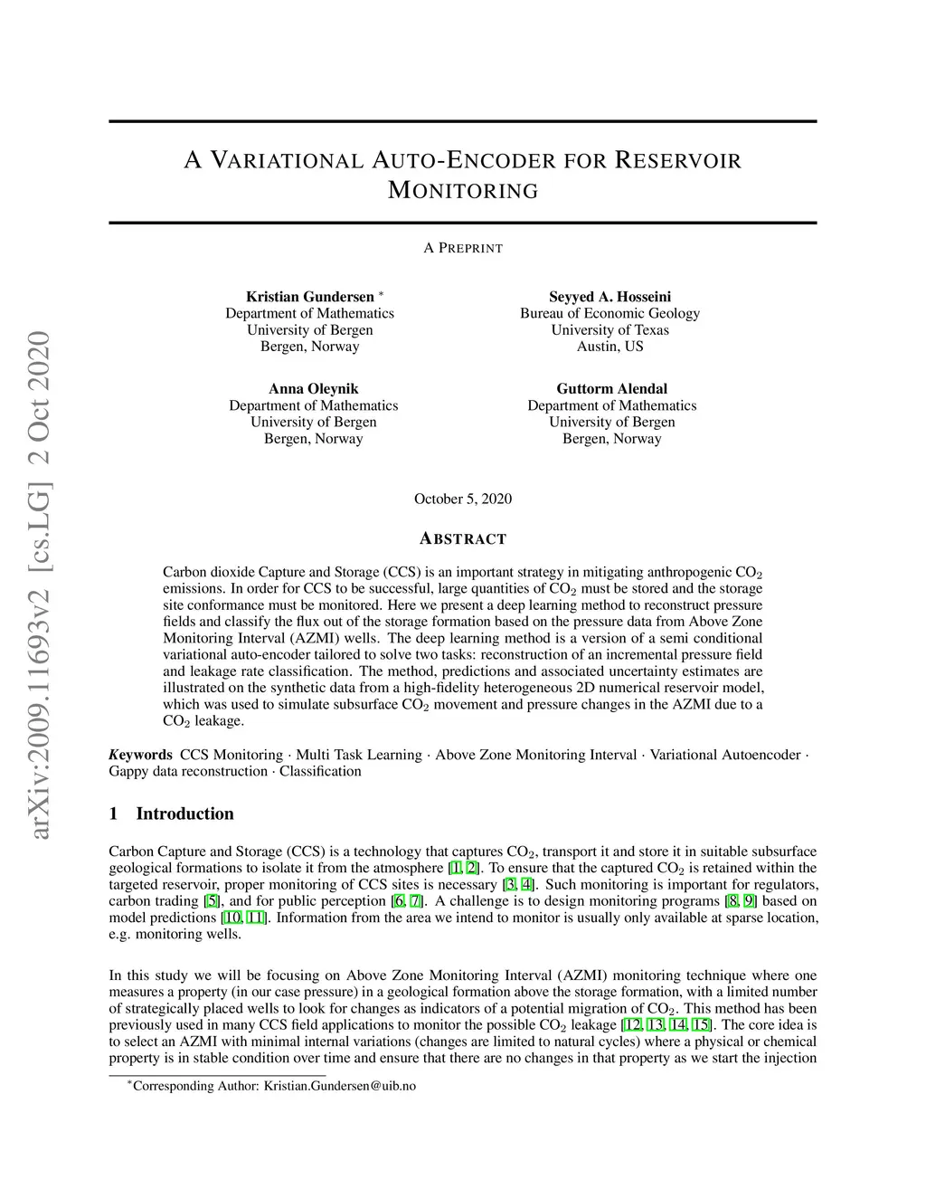 Carbon dioxide Capture and Storage (CCS) is an important strategy in mitigating anthropogenic CO emissions. In order for CCS to be successful, large quantities of CO must be stored and the storage site conformance must be monitored. Here we present a deep learning method to reconstruct pressure fields and classify the flux out of the storage formation based on the pressure data from Above Zone Monitoring Interval (AZMI) wells. The deep learning method is a version of a semi conditional variational auto-encoder tailored to solve two tasks: reconstruction of an incremental pressure field and leakage rate classification. The method, predictions and associated uncertainty estimates are illustrated on the synthetic data from a high-fidelity heterogeneous 2D numerical reservoir model, which was used to simulate subsurface CO movement and pressure changes in the AZMI due to a CO leakage.