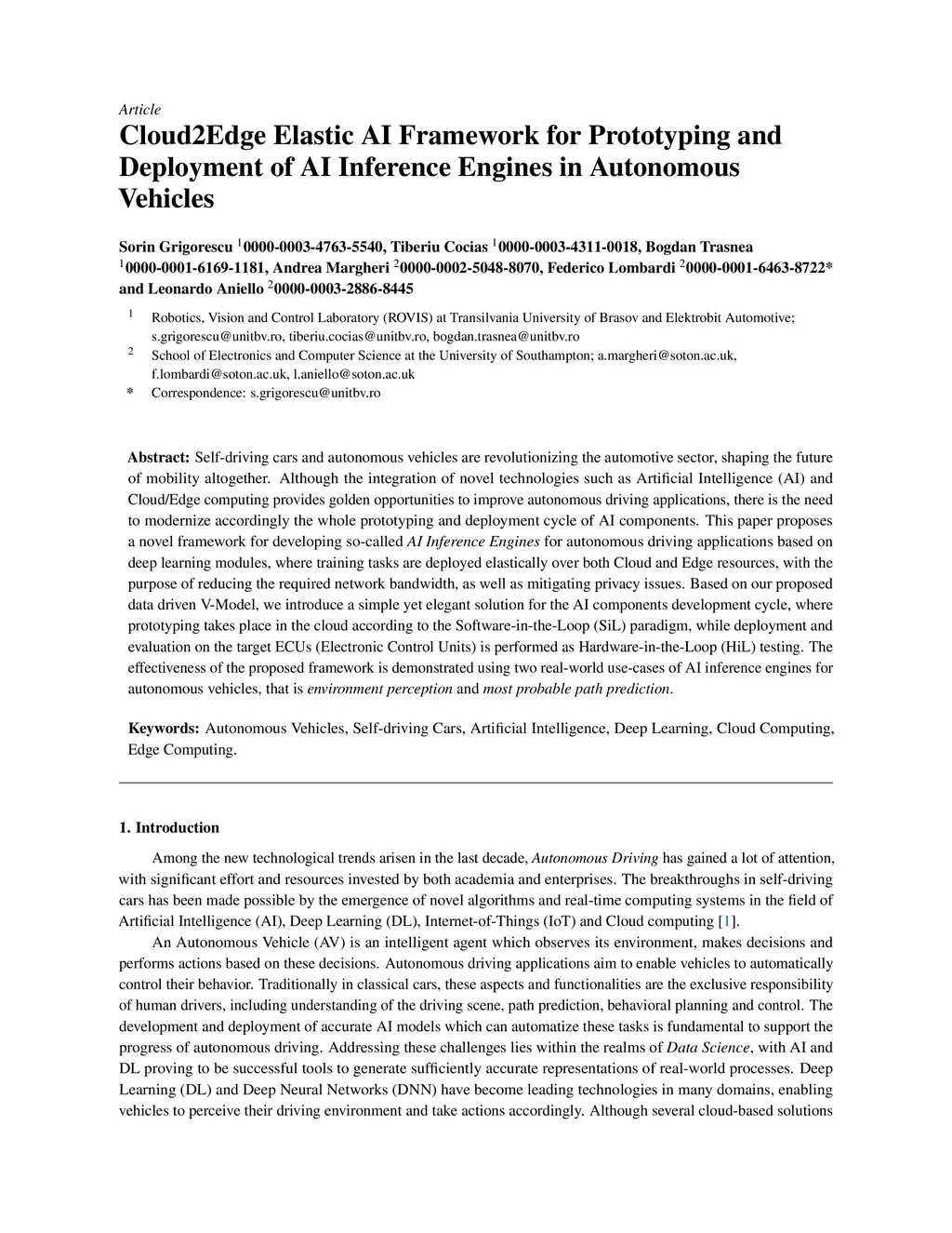 Self-driving cars and autonomous vehicles are revolutionizing the automotive sector, shaping the future of mobility altogether. Although the integration of novel technologies such as Artificial Intelligence (AI) and Cloud/Edge computing provides golden opportunities to improve autonomous driving applications, there is the need to modernize accordingly the whole prototyping and deployment cycle of AI components. This paper proposes a novel framework for developing so-called AI Inference Engines for autonomous driving applications based on deep learning modules, where training tasks are deployed elastically over both Cloud and Edge resources, with the purpose of reducing the required network bandwidth, as well as mitigating privacy issues. Based on our proposed data driven V-Model, we introduce a simple yet elegant solution for the AI components development cycle, where prototyping takes place in the cloud according to the Software-in-the-Loop (SiL) paradigm, while deployment and evaluation on the target ECUs (Electronic Control Units) is performed as Hardware-in-the-Loop (HiL) testing. The effectiveness of the proposed framework is demonstrated using two real-world use-cases of AI inference engines for autonomous vehicles, that is environment perception and most probable path prediction.