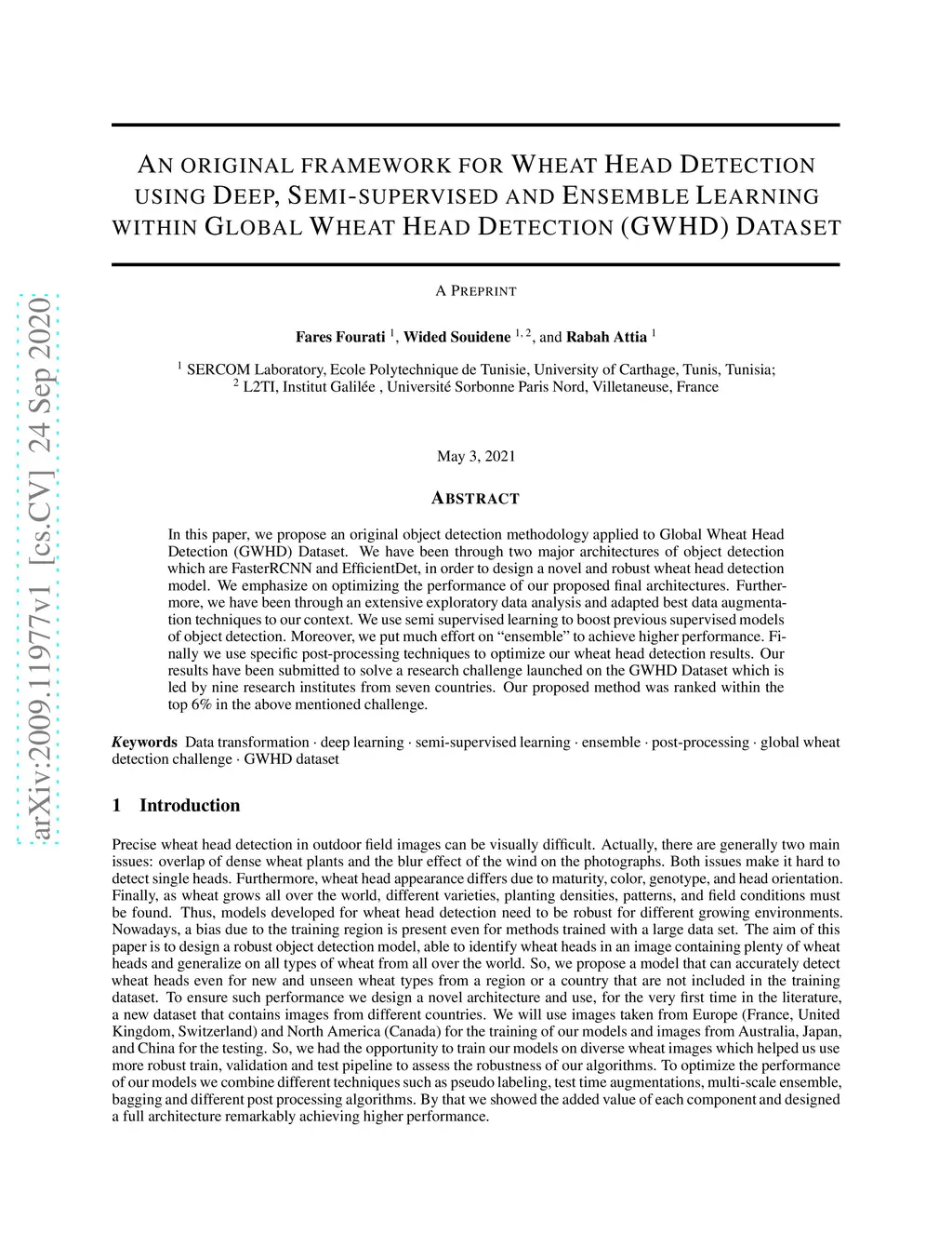 In this paper, we propose an original object detection methodology applied to Global Wheat Head Detection (GWHD) Dataset. We have been through two major architectures of object detection which are FasterRCNN and EfficientDet, in order to design a novel and robust wheat head detection model. We emphasize on optimizing the performance of our proposed final architectures. Furthermore, we have been through an extensive exploratory data analysis and adapted best data augmentation techniques to our context. We use semi supervised learning to boost previous supervised models of object detection. Moreover, we put much effort on ensemble to achieve higher performance. Finally we use specific post-processing techniques to optimize our wheat head detection results. Our results have been submitted to solve a research challenge launched on the GWHD Dataset which is led by nine research institutes from seven countries. Our proposed method was ranked within the top 6% in the above mentioned challenge.