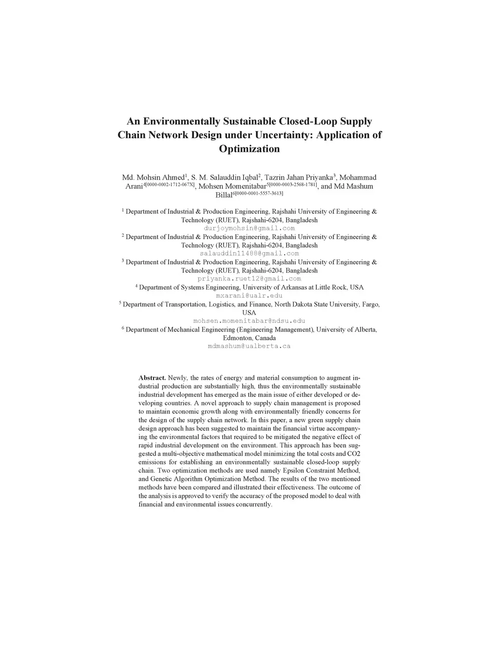 Newly, the rates of energy and material consumption to augment industrial pro-duction are substantially high, thus the environmentally sustainable industrial de-velopment has emerged as the main issue of either developed or developing coun-tries. A novel approach to supply chain management is proposed to maintain economic growth along with environmentally friendly concerns for the design of the supply chain network. In this paper, a new green supply chain design approach has been suggested to maintain the financial virtue accompanying the environ-mental factors that required to be mitigated the negative effect of rapid industrial development on the environment. This approach has been suggested a multi-objective mathematical model minimizing the total costs and CO2 emissions for establishing an environmentally sustainable closed-loop supply chain. Two opti-mization methods are used namely Epsilon Constraint Method, and Genetic Al-gorithm Optimization Method. The results of the two mentioned methods have been compared and illustrated their effectiveness. The outcome of the analysis is approved to verify the accuracy of the proposed model to deal with financial and environmental issues concurrently.