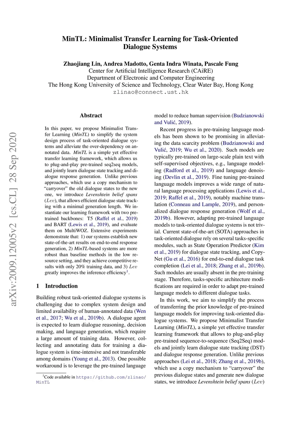 In this paper, we propose Minimalist Transfer Learning (MinTL) to simplify the system design process of task-oriented dialogue systems and alleviate the over-dependency on annotated data. MinTL is a simple yet effective transfer learning framework, which allows us to plug-and-play pre-trained seq2seq models, and jointly learn dialogue state tracking and dialogue response generation. Unlike previous approaches, which use a copy mechanism to "carryover" the old dialogue states to the new one, we introduce Levenshtein belief spans (Lev), that allows efficient dialogue state tracking with a minimal generation length. We instantiate our learning framework with two pre-trained backbones: T5 and BART, and evaluate them on MultiWOZ. Extensive experiments demonstrate that: 1) our systems establish new state-of-the-art results on end-to-end response generation, 2) MinTL-based systems are more robust than baseline methods in the low resource setting, and they achieve competitive results with only 20\% training data, and 3) Lev greatly improves the inference efficiency.