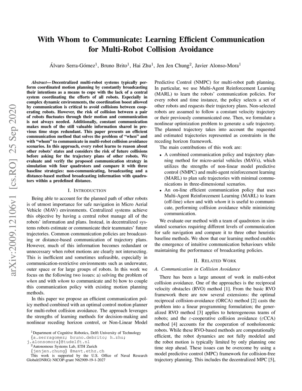 Decentralized multi-robot systems typically perform coordinated motion planning by constantly broadcasting their intentions as a means to cope with the lack of a central system coordinating the efforts of all robots. Especially in complex dynamic environments, the coordination boost allowed by communication is critical to avoid collisions between cooperating robots. However, the risk of collision between a pair of robots fluctuates through their motion and communication is not always needed. Additionally, constant communication makes much of the still valuable information shared in previous time steps redundant. This paper presents an efficient communication method that solves the problem of "when" and with "whom" to communicate in multi-robot collision avoidance scenarios. In this approach, every robot learns to reason about other robots' states and considers the risk of future collisions before asking for the trajectory plans of other robots. We evaluate and verify the proposed communication strategy in simulation with four quadrotors and compare it with three baseline strategies: non-communicating, broadcasting and a distance-based method broadcasting information with quadrotors within a predefined distance.