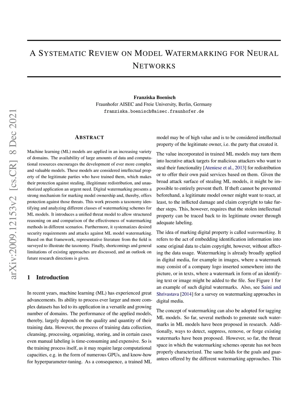 A Systematic Review on Model Watermarking for Neural Networks