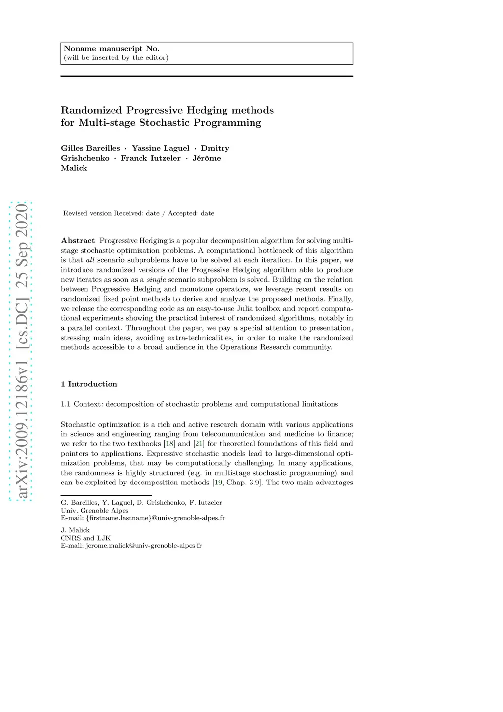Progressive Hedging is a popular decomposition algorithm for solving multi-stage stochastic optimization problems. A computational bottleneck of this algorithm is that all scenario subproblems have to be solved at each iteration. In this paper, we introduce randomized versions of the Progressive Hedging algorithm able to produce new iterates as soon as a single scenario subproblem is solved. Building on the relation between Progressive Hedging and monotone operators, we leverage recent results on randomized fixed point methods to derive and analyze the proposed methods. Finally, we release the corresponding code as an easy-to-use Julia toolbox and report computational experiments showing the practical interest of randomized algorithms, notably in a parallel context. Throughout the paper, we pay a special attention to presentation, stressing main ideas, avoiding extra-technicalities, in order to make the randomized methods accessible to a broad audience in the Operations Research community.