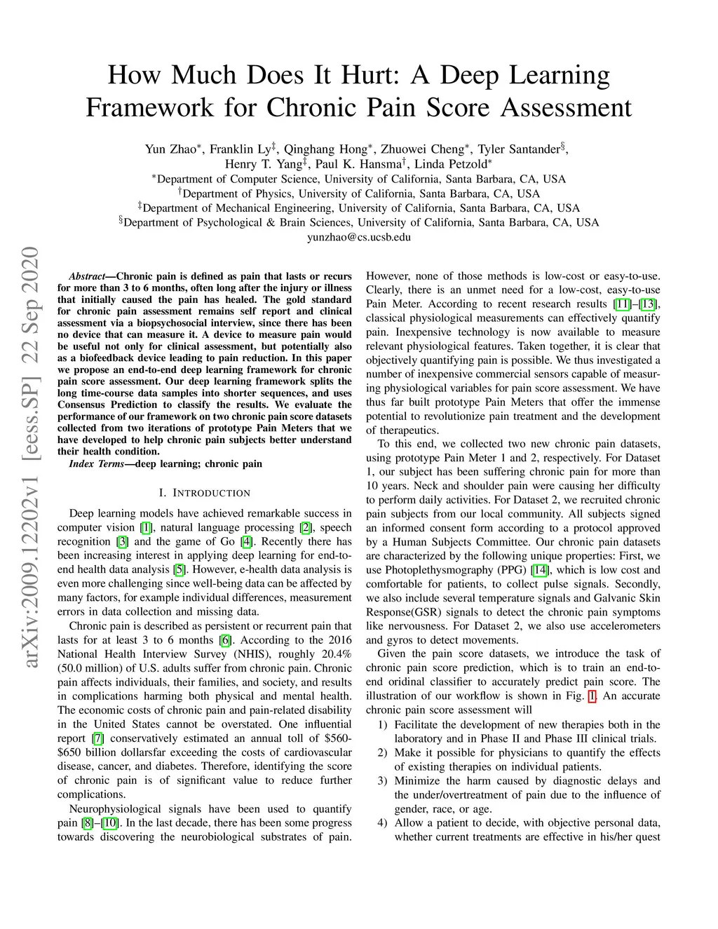 Chronic pain is defined as pain that lasts or recurs for more than 3 to 6 months, often long after the injury or illness that initially caused the pain has healed. The "gold standard" for chronic pain assessment remains self report and clinical assessment via a biopsychosocial interview, since there has been no device that can measure it. A device to measure pain would be useful not only for clinical assessment, but potentially also as a biofeedback device leading to pain reduction. In this paper we propose an end-to-end deep learning framework for chronic pain score assessment. Our deep learning framework splits the long time-course data samples into shorter sequences, and uses Consensus Prediction to classify the results. We evaluate the performance of our framework on two chronic pain score datasets collected from two iterations of prototype Pain Meters that we have developed to help chronic pain subjects better understand their health condition.