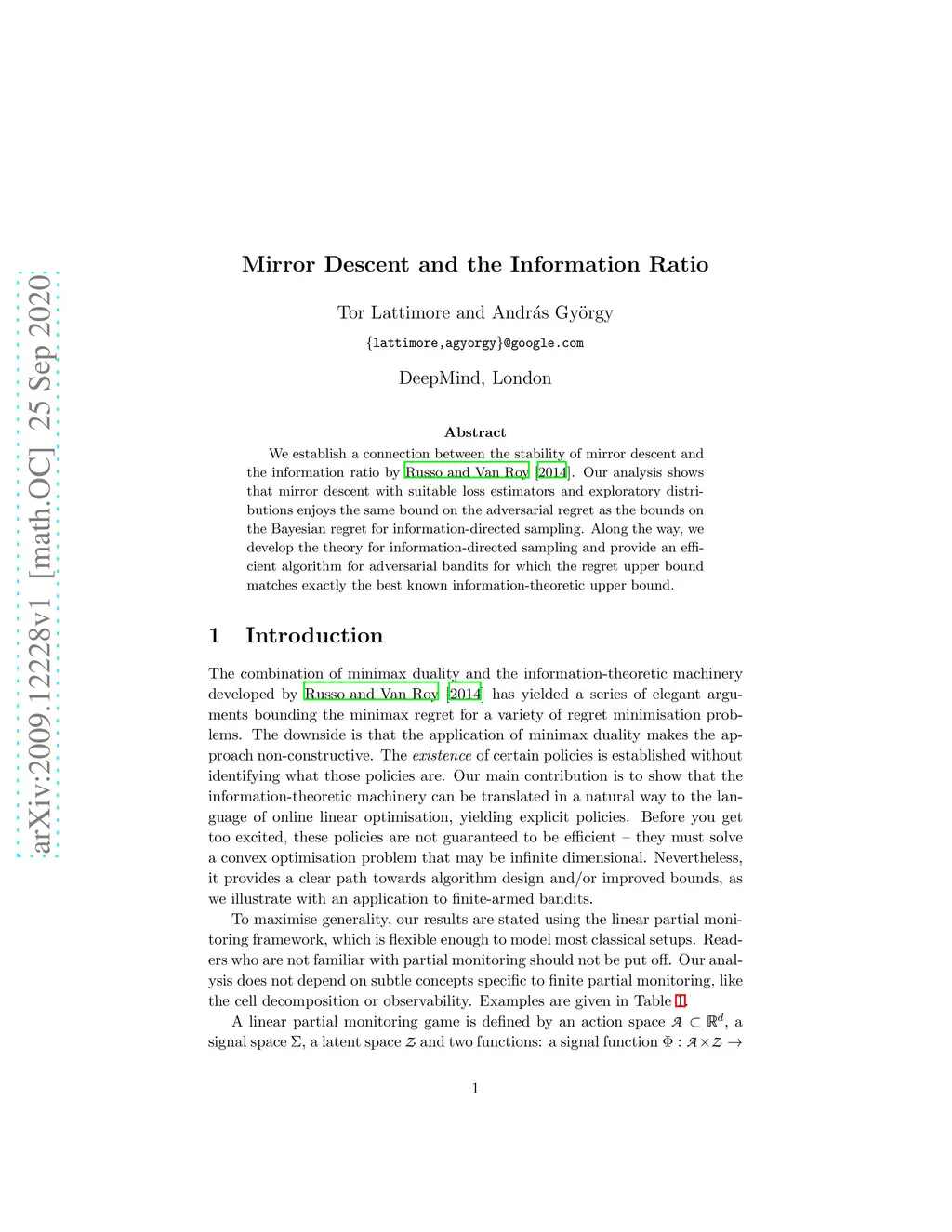 We establish a connection between the stability of mirror descent and the information ratio by Russo and Van Roy [2014]. Our analysis shows that mirror descent with suitable loss estimators and exploratory distributions enjoys the same bound on the adversarial regret as the bounds on the Bayesian regret for information-directed sampling. Along the way, we develop the theory for information-directed sampling and provide an efficient algorithm for adversarial bandits for which the regret upper bound matches exactly the best known information-theoretic upper bound.