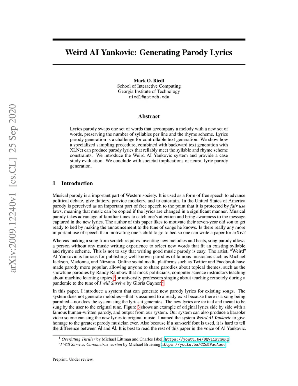 Lyrics parody swaps one set of words that accompany a melody with a new set of words, preserving the number of syllables per line and the rhyme scheme. Lyrics parody generation is a challenge for controllable text generation. We show how a specialized sampling procedure, combined with backward text generation with XLNet can produce parody lyrics that reliably meet the syllable and rhyme scheme constraints.We introduce the Weird AI Yankovic system and provide a case study evaluation. We conclude with societal implications of neural lyric parody generation.