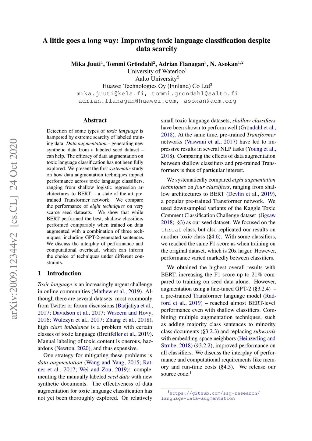 Detection of some types of toxic language is hampered by extreme scarcity of labeled training data. Data augmentation - generating new synthetic data from a labeled seed dataset - can help. The efficacy of data augmentation on toxic language classification has not been fully explored. We present the first systematic study on how data augmentation techniques impact performance across toxic language classifiers, ranging from shallow logistic regression architectures to BERT - a state-of-the-art pre-trained Transformer network. We compare the performance of eight techniques on very scarce seed datasets. We show that while BERT performed the best, shallow classifiers performed comparably when trained on data augmented with a combination of three techniques, including GPT-2-generated sentences. We discuss the interplay of performance and computational overhead, which can inform the choice of techniques under different constraints.