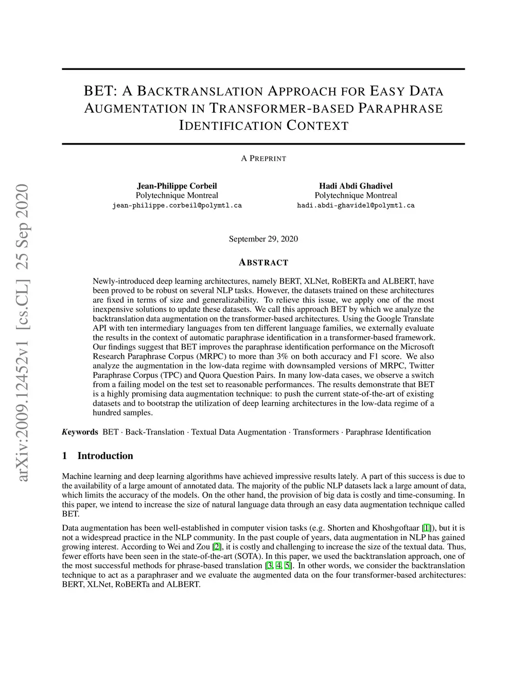 Newly-introduced deep learning architectures, namely BERT, XLNet, RoBERTa and ALBERT, have been proved to be robust on several NLP tasks. However, the datasets trained on these architectures are fixed in terms of size and generalizability. To relieve this issue, we apply one of the most inexpensive solutions to update these datasets. We call this approach BET by which we analyze the backtranslation data augmentation on the transformer-based architectures. Using the Google Translate API with ten intermediary languages from ten different language families, we externally evaluate the results in the context of automatic paraphrase identification in a transformer-based framework. Our findings suggest that BET improves the paraphrase identification performance on the Microsoft Research Paraphrase Corpus (MRPC) to more than 3% on both accuracy and F1 score. We also analyze the augmentation in the low-data regime with downsampled versions of MRPC, Twitter Paraphrase Corpus (TPC) and Quora Question Pairs. In many low-data cases, we observe a switch from a failing model on the test set to reasonable performances. The results demonstrate that BET is a highly promising data augmentation technique: to push the current state-of-the-art of existing datasets and to bootstrap the utilization of deep learning architectures in the low-data regime of a hundred samples.