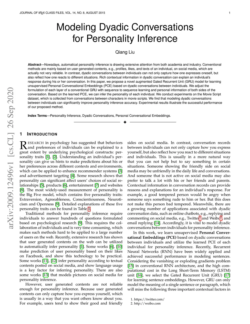 Nowadays, automatical personality inference is drawing extensive attention from both academia and industry. Conventional methods are mainly based on user generated contents, e.g., profiles, likes, and texts of an individual, on social media, which are actually not very reliable. In contrast, dyadic conversations between individuals can not only capture how one expresses oneself, but also reflect how one reacts to different situations. Rich contextual information in dyadic conversation can explain an individual's response during his or her conversation. In this paper, we propose a novel augmented Gated Recurrent Unit (GRU) model for learning unsupervised Personal Conversational Embeddings (PCE) based on dyadic conversations between individuals. We adjust the formulation of each layer of a conventional GRU with sequence to sequence learning and personal information of both sides of the conversation. Based on the learned PCE, we can infer the personality of each individual. We conduct experiments on the Movie Script dataset, which is collected from conversations between characters in movie scripts. We find that modeling dyadic conversations between individuals can significantly improve personality inference accuracy. Experimental results illustrate the successful performance of our proposed method.