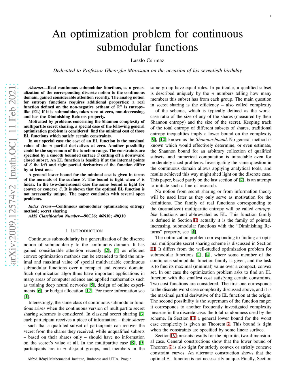 Real continuous submodular functions, as a generalization of the corresponding discrete notion to the continuous domain, gained considerable attention recently. The analog notion for entropy functions requires additional properties: a real function defined on the non-negative orthant of is entropy-like (EL) if it is submodular, takes zero at zero, non-decreasing, and has the Diminishing Returns property. Motivated by problems concerning the Shannon complexity of multipartite secret sharing, a special case of the following general optimization problem is considered: find the minimal cost of those EL functions which satisfy certain constraints. In our special case the cost of an EL function is the maximal value of the partial derivatives at zero. Another possibility could be the supremum of the function range. The constraints are specified by a smooth bounded surface cutting off a downward closed subset. An EL function is feasible if at the internal points of the left and right partial derivatives of the function differ by at least one. A general lower bound for the minimal cost is given in terms of the normals of the surface . The bound is tight when is linear. In the two-dimensional case the same bound is tight for convex or concave . It is shown that the optimal EL function is not necessarily unique. The paper concludes with several open problems.