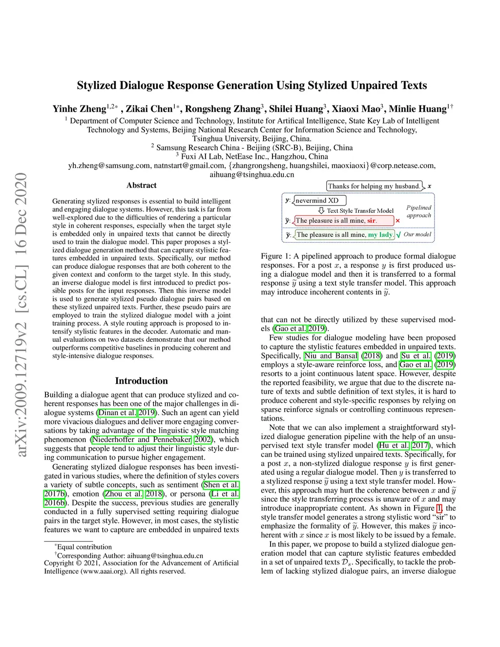 Generating stylized responses is essential to build intelligent and engaging dialogue systems. However, this task is far from well-explored due to the difficulties of rendering a particular style in coherent responses, especially when the target style is embedded only in unpaired texts that cannot be directly used to train the dialogue model. This paper proposes a stylized dialogue generation method that can capture stylistic features embedded in unpaired texts. Specifically, our method can produce dialogue responses that are both coherent to the given context and conform to the target style. In this study, an inverse dialogue model is first introduced to predict possible posts for the input responses, and then this inverse model is used to generate stylized pseudo dialogue pairs based on these stylized unpaired texts. Further, these pseudo pairs are employed to train the stylized dialogue model with a joint training process, and a style routing approach is proposed to intensify stylistic features in the decoder. Automatic and manual evaluations on two datasets demonstrate that our method outperforms competitive baselines in producing coherent and style-intensive dialogue responses.