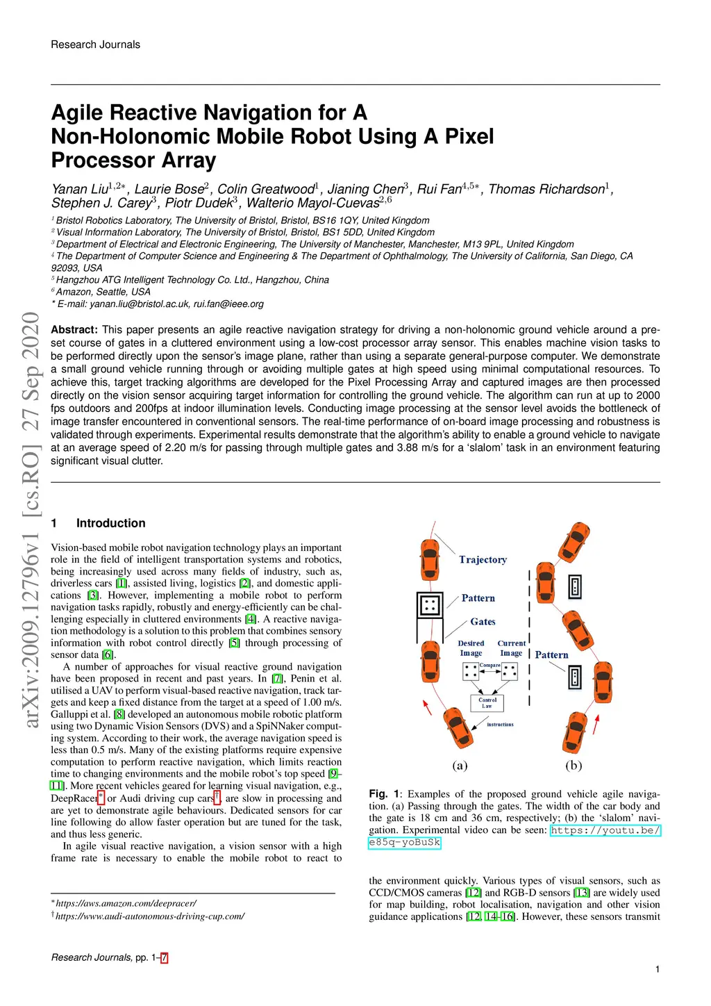This paper presents an agile reactive navigation strategy for driving a non-holonomic ground vehicle around a preset course of gates in a cluttered environment using a low-cost processor array sensor. This enables machine vision tasks to be performed directly upon the sensor's image plane, rather than using a separate general-purpose computer. We demonstrate a small ground vehicle running through or avoiding multiple gates at high speed using minimal computational resources. To achieve this, target tracking algorithms are developed for the Pixel Processing Array and captured images are then processed directly on the vision sensor acquiring target information for controlling the ground vehicle. The algorithm can run at up to 2000 fps outdoors and 200fps at indoor illumination levels. Conducting image processing at the sensor level avoids the bottleneck of image transfer encountered in conventional sensors. The real-time performance of on-board image processing and robustness is validated through experiments. Experimental results demonstrate that the algorithm's ability to enable a ground vehicle to navigate at an average speed of 2.20 m/s for passing through multiple gates and 3.88 m/s for a 'slalom' task in an environment featuring significant visual clutter.