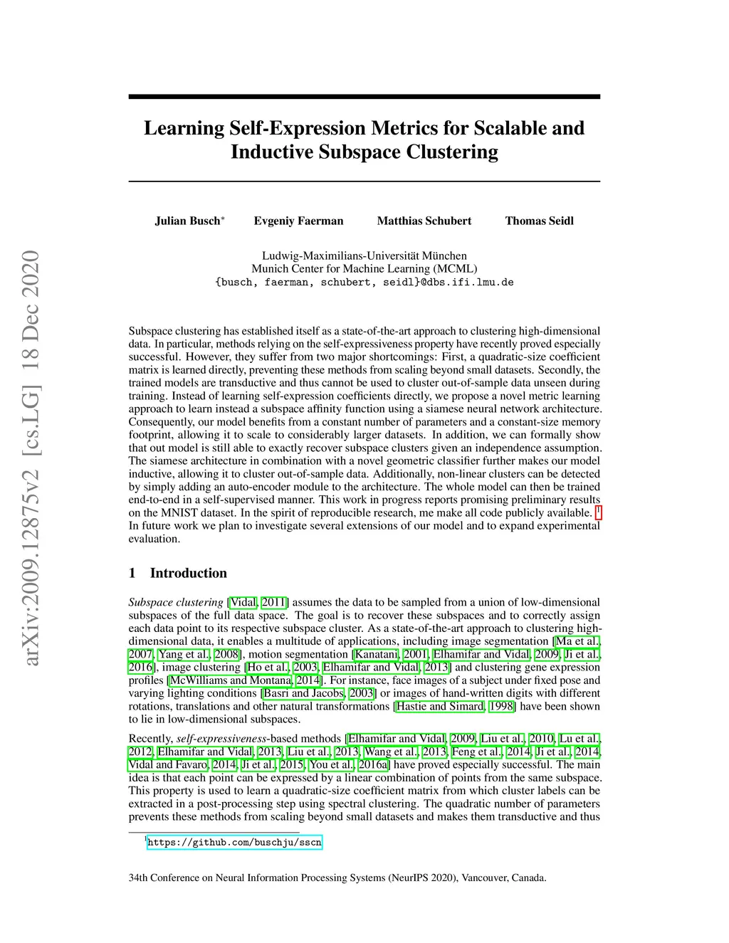 Learning Self-Expression Metrics for Scalable and Inductive Subspace