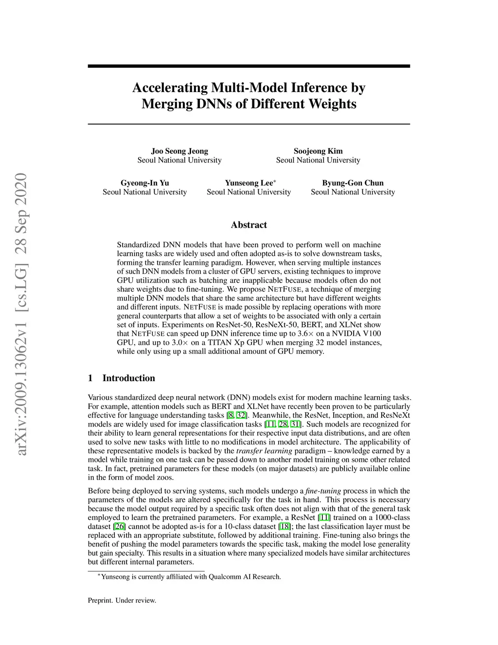 Standardized DNN models that have been proved to perform well on machine learning tasks are widely used and often adopted as-is to solve downstream tasks, forming the transfer learning paradigm. However, when serving multiple instances of such DNN models from a cluster of GPU servers, existing techniques to improve GPU utilization such as batching are inapplicable because models often do not share weights due to fine-tuning. We propose NetFuse, a technique of merging multiple DNN models that share the same architecture but have different weights and different inputs. NetFuse is made possible by replacing operations with more general counterparts that allow a set of weights to be associated with only a certain set of inputs. Experiments on ResNet-50, ResNeXt-50, BERT, and XLNet show that NetFuse can speed up DNN inference time up to 3.6x on a NVIDIA V100 GPU, and up to 3.0x on a TITAN Xp GPU when merging 32 model instances, while only using up a small additional amount of GPU memory.