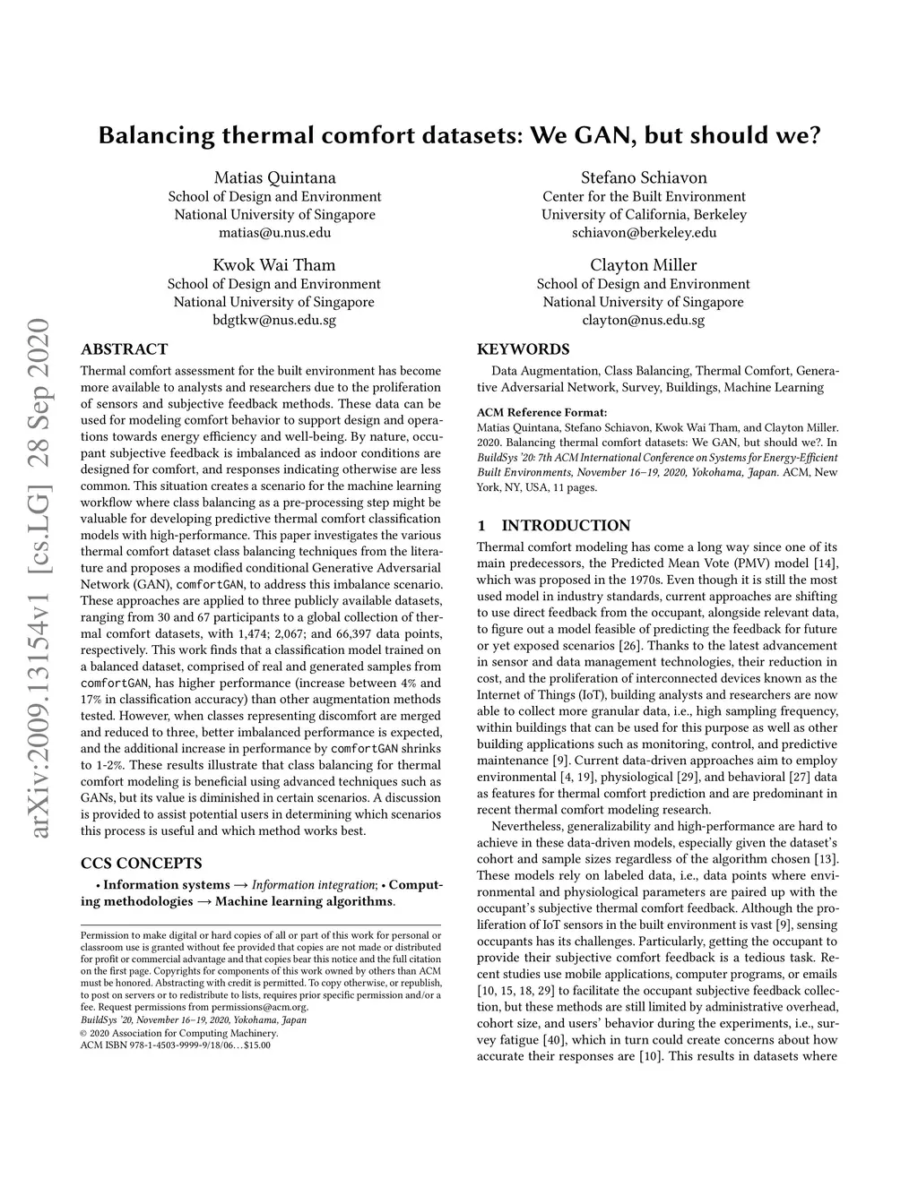 Thermal comfort assessment for the built environment has become more available to analysts and researchers due to the proliferation of sensors and subjective feedback methods. These data can be used for modeling comfort behavior to support design and operations towards energy efficiency and well-being. By nature, occupant subjective feedback is imbalanced as indoor conditions are designed for comfort, and responses indicating otherwise are less common. This situation creates a scenario for the machine learning workflow where class balancing as a pre-processing step might be valuable for developing predictive thermal comfort classification models with high-performance. This paper investigates the various thermal comfort dataset class balancing techniques from the literature and proposes a modified conditional Generative Adversarial Network (GAN), , to address this imbalance scenario. These approaches are applied to three publicly available datasets, ranging from 30 and 67 participants to a global collection of thermal comfort datasets, with 1,474; 2,067; and 66,397 data points, respectively. This work finds that a classification model trained on a balanced dataset, comprised of real and generated samples from , has higher performance (increase between 4% and 17% in classification accuracy) than other augmentation methods tested. However, when classes representing discomfort are merged and reduced to three, better imbalanced performance is expected, and the additional increase in performance by shrinks to 1-2%. These results illustrate that class balancing for thermal comfort modeling is beneficial using advanced techniques such as GANs, but its value is diminished in certain scenarios. A discussion is provided to assist potential users in determining which scenarios this process is useful and which method works best.
