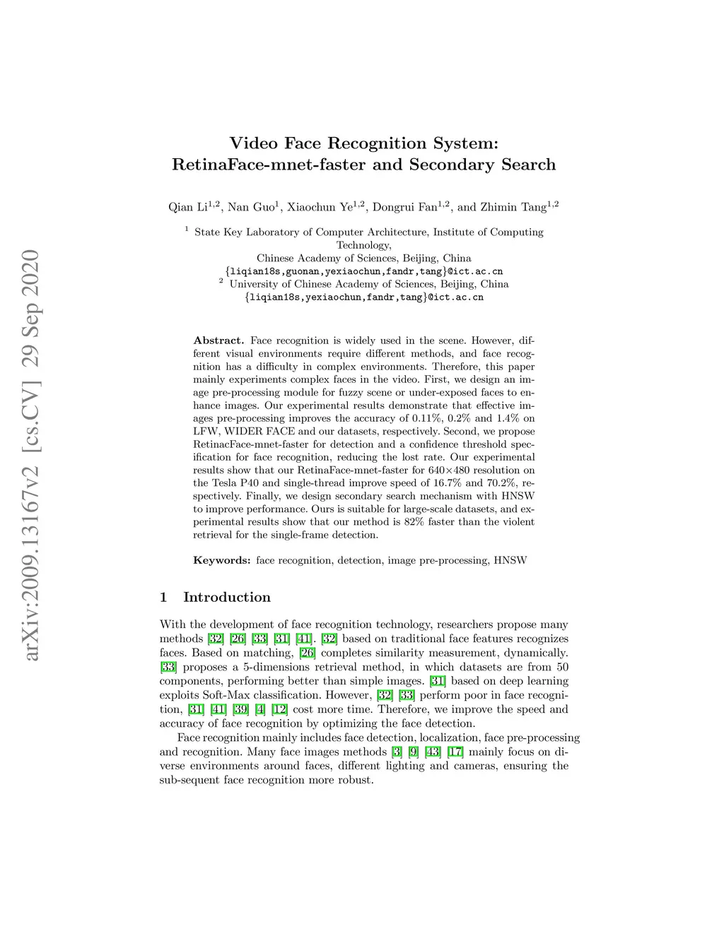 Face recognition is widely used in the scene. However, different visual environments require different methods, and face recognition has a difficulty in complex environments. Therefore, this paper mainly experiments complex faces in the video. First, we design an image pre-processing module for fuzzy scene or under-exposed faces to enhance images. Our experimental results demonstrate that effective images pre-processing improves the accuracy of 0.11%, 0.2% and 1.4% on LFW, WIDER FACE and our datasets, respectively. Second, we propose RetinacFace-mnet-faster for detection and a confidence threshold specification for face recognition, reducing the lost rate. Our experimental results show that our RetinaFace-mnet-faster for 640*480 resolution on the Tesla P40 and single-thread improve speed of 16.7% and 70.2%, respectively. Finally, we design secondary search mechanism with HNSW to improve performance. Ours is suitable for large-scale datasets, and experimental results show that our method is 82% faster than the violent retrieval for the single-frame detection.