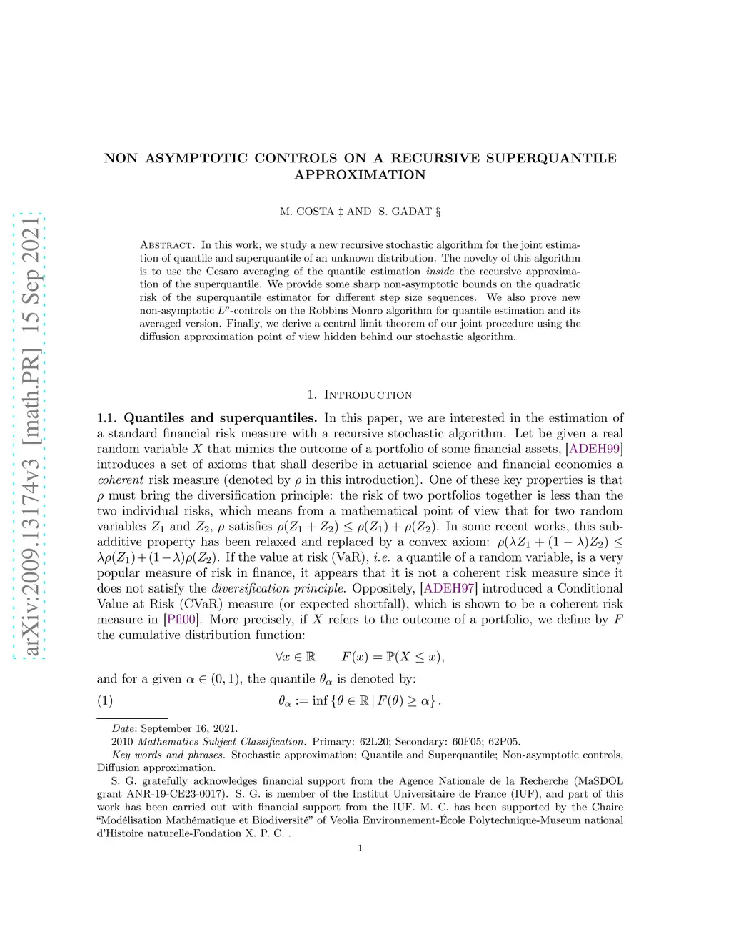 In this work, we study a new recursive stochastic algorithm for the joint estimation of quantile and superquantile of an unknown distribution. The novelty of this algorithm is to use the Cesaro averaging of the quantile estimation inside the recursive approximation of the superquantile. We provide some sharp non-asymptotic bounds on the quadratic risk of the superquantile estimator for different step size sequences. We also prove new non-asymptotic -controls on the Robbins Monro algorithm for quantile estimation and its averaged version. Finally, we derive a central limit theorem of our joint procedure using the diffusion approximation point of view hidden behind our stochastic algorithm.