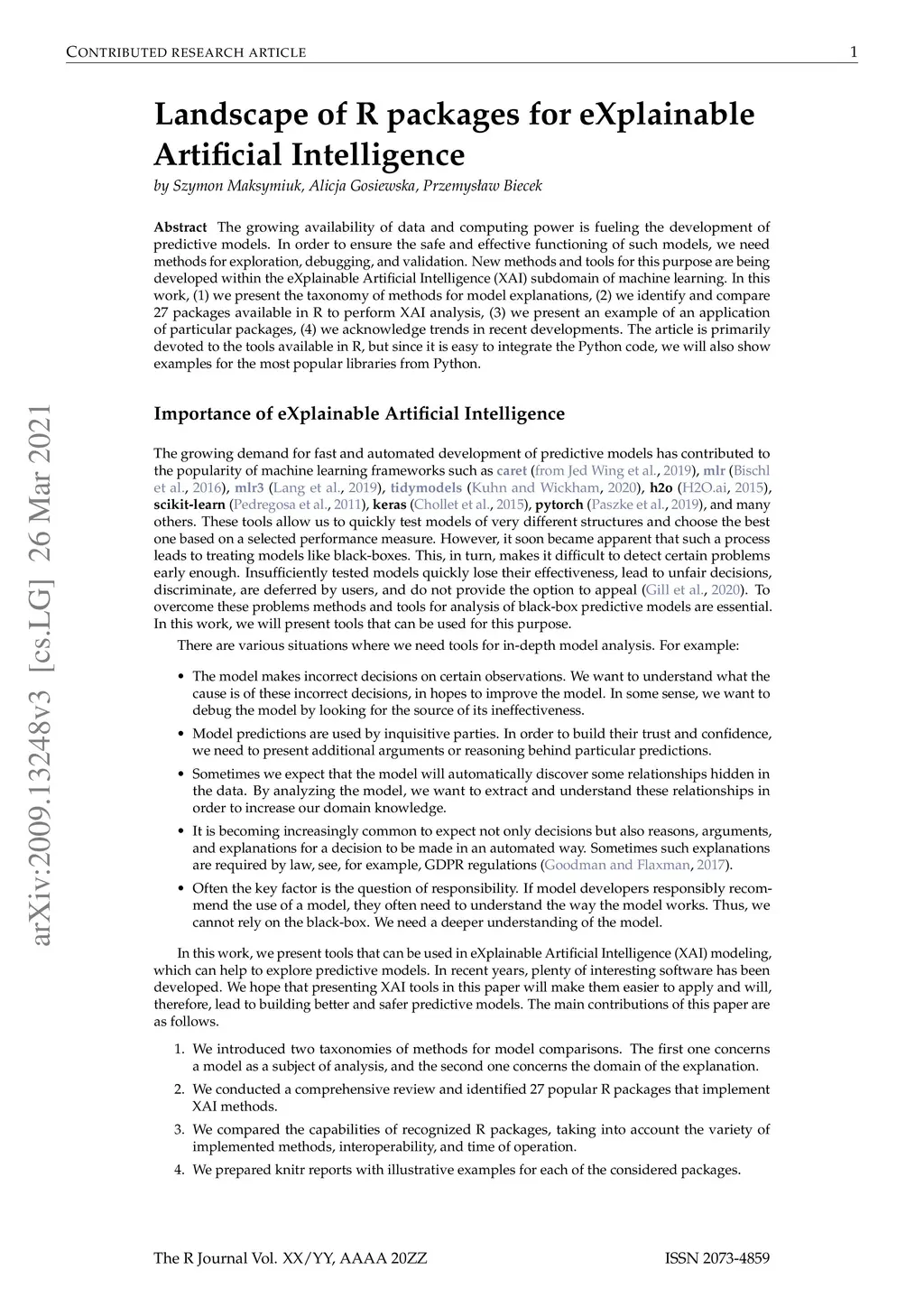 The growing availability of data and computing power fuels the development of predictive models. In order to ensure the safe and effective functioning of such models, we need methods for exploration, debugging, and validation. New methods and tools for this purpose are being developed within the eXplainable Artificial Intelligence (XAI) subdomain of machine learning. In this work (1) we present the taxonomy of methods for model explanations, (2) we identify and compare 27 packages available in R to perform XAI analysis, (3) we present an example of an application of particular packages, (4) we acknowledge recent trends in XAI. The article is primarily devoted to the tools available in R, but since it is easy to integrate the Python code, we will also show examples for the most popular libraries from Python.