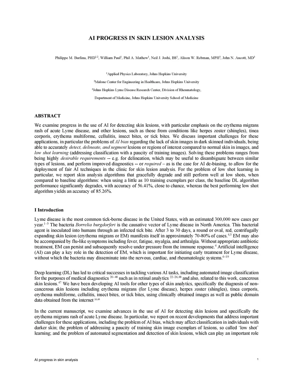 We examine progress in the use of AI for detecting skin lesions, with particular emphasis on the erythema migrans rash of acute Lyme disease, and other lesions, such as those from conditions like herpes zoster (shingles), tinea corporis, erythema multiforme, cellulitis, insect bites, or tick bites. We discuss important challenges for these applications, in particular the problems of AI bias regarding the lack of skin images in dark skinned individuals, being able to accurately detect, delineate, and segment lesions or regions of interest compared to normal skin in images, and low shot learning (addressing classification with a paucity of training images). Solving these problems ranges from being highly desirable requirements -- e.g. for delineation, which may be useful to disambiguate between similar types of lesions, and perform improved diagnostics -- or required, as is the case for AI de-biasing, to allow for the deployment of fair AI techniques in the clinic for skin lesion analysis. For the problem of low shot learning in particular, we report skin analysis algorithms that gracefully degrade and still perform well at low shots, when compared to baseline algorithms: when using a little as 10 training exemplars per class, the baseline DL algorithm performance significantly degrades, with accuracy of 56.41%, close to chance, whereas the best performing low shot algorithm yields an accuracy of 85.26%.