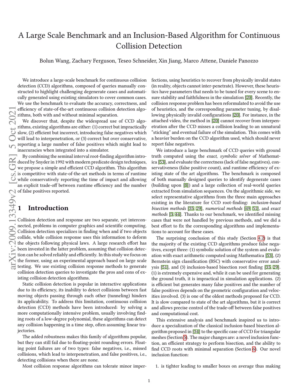 We introduce a large scale benchmark for continuous collision detection (CCD) algorithms, composed of queries manually constructed to highlight challenging degenerate cases and automatically generated using existing simulators to cover common cases. We use the benchmark to evaluate the accuracy, correctness, and efficiency of state-of-the-art continuous collision detection algorithms, both with and without minimal separation. We discover that, despite the widespread use of CCD algorithms, existing algorithms are either: (1) correct but impractically slow, (2) efficient but incorrect, introducing false negatives which will lead to interpenetration, or (3) correct but over conservative, reporting a large number of false positives which might lead to inaccuracies when integrated in a simulator. By combining the seminal interval root finding algorithm introduced by Snyder in 1992 with modern predicate design techniques, we propose a simple and efficient CCD algorithm. This algorithm is competitive with state of the art methods in terms of runtime while conservatively reporting the time of impact and allowing explicit trade off between runtime efficiency and number of false positives reported.