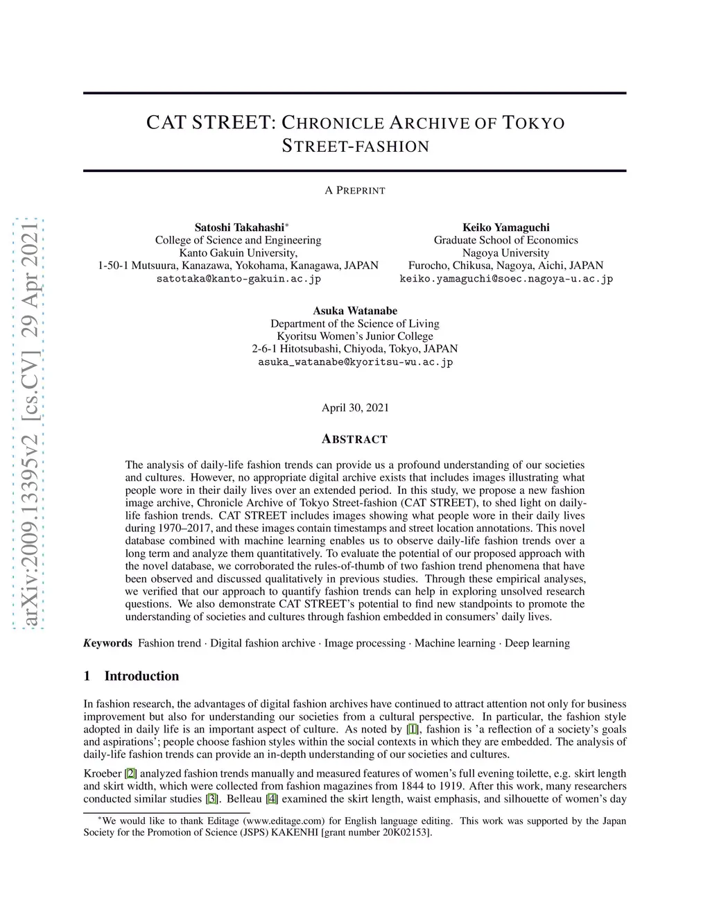 The analysis of daily-life fashion trends can provide us a profound understanding of our societies and cultures. However, no appropriate digital archive exists that includes images illustrating what people wore in their daily lives over an extended period. In this study, we propose a new fashion image archive, Chronicle Archive of Tokyo Street-fashion (CAT STREET), to shed light on daily-life fashion trends. CAT STREET includes images showing what people wore in their daily lives during 1970--2017, and these images contain timestamps and street location annotations. This novel database combined with machine learning enables us to observe daily-life fashion trends over a long term and analyze them quantitatively. To evaluate the potential of our proposed approach with the novel database, we corroborated the rules-of-thumb of two fashion trend phenomena that have been observed and discussed qualitatively in previous studies. Through these empirical analyses, we verified that our approach to quantify fashion trends can help in exploring unsolved research questions. We also demonstrate CAT STREET's potential to find new standpoints to promote the understanding of societies and cultures through fashion embedded in consumers' daily lives.