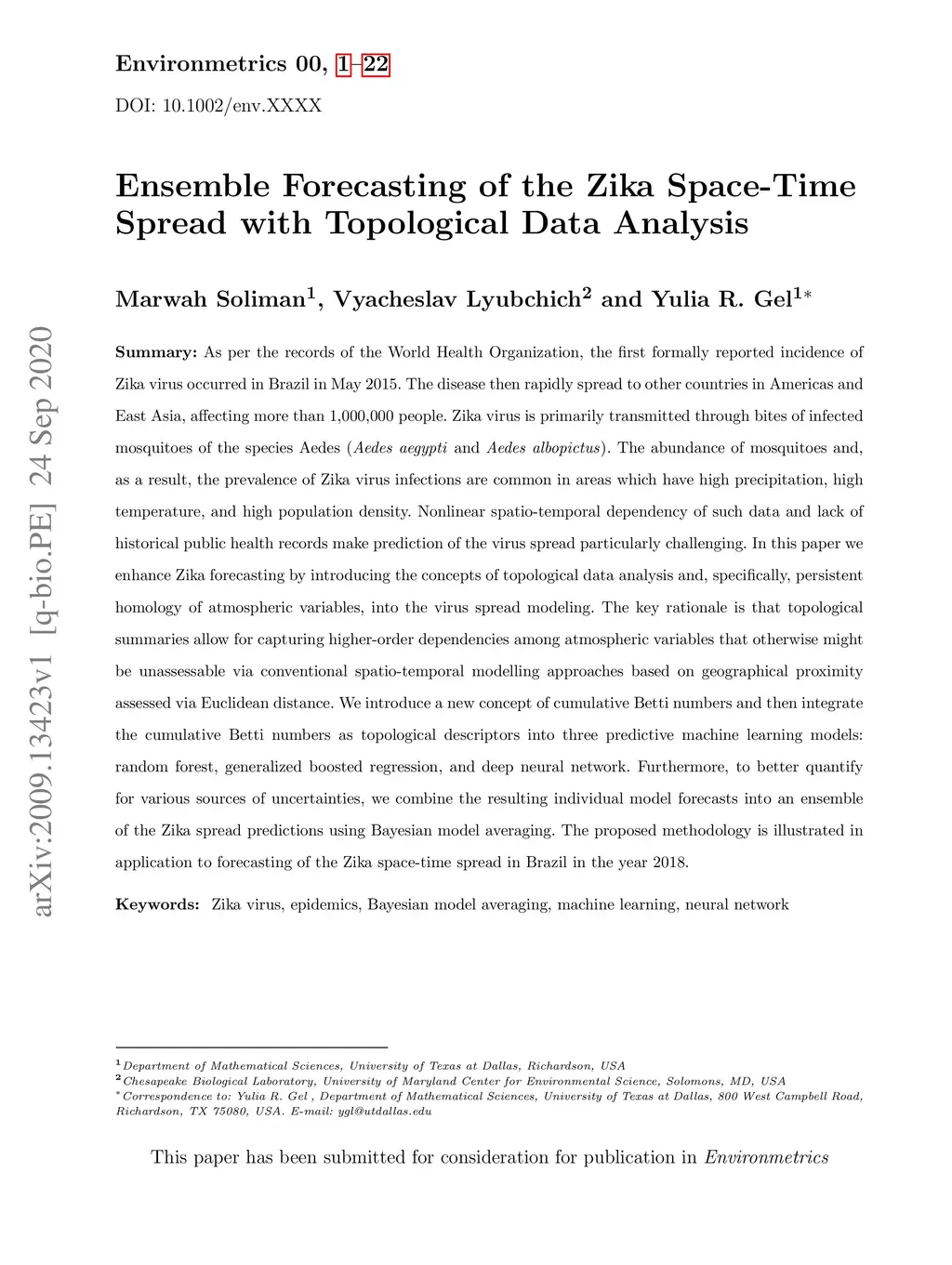 Ensemble Forecasting of the Zika Space-TimeSpread with Topological Data