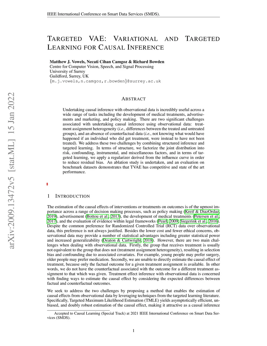 Undertaking causal inference with observational data is incredibly useful across a wide range of tasks including the development of medical treatments, advertisements and marketing, and policy making. There are two significant challenges associated with undertaking causal inference using observational data: treatment assignment heterogeneity (\textit{i.e.}, differences between the treated and untreated groups), and an absence of counterfactual data (\textit{i.e.}, not knowing what would have happened if an individual who did get treatment, were instead to have not been treated). We address these two challenges by combining structured inference and targeted learning. In terms of structure, we factorize the joint distribution into risk, confounding, instrumental, and miscellaneous factors, and in terms of targeted learning, we apply a regularizer derived from the influence curve in order to reduce residual bias. An ablation study is undertaken, and an evaluation on benchmark datasets demonstrates that TVAE has competitive and state of the art performance.