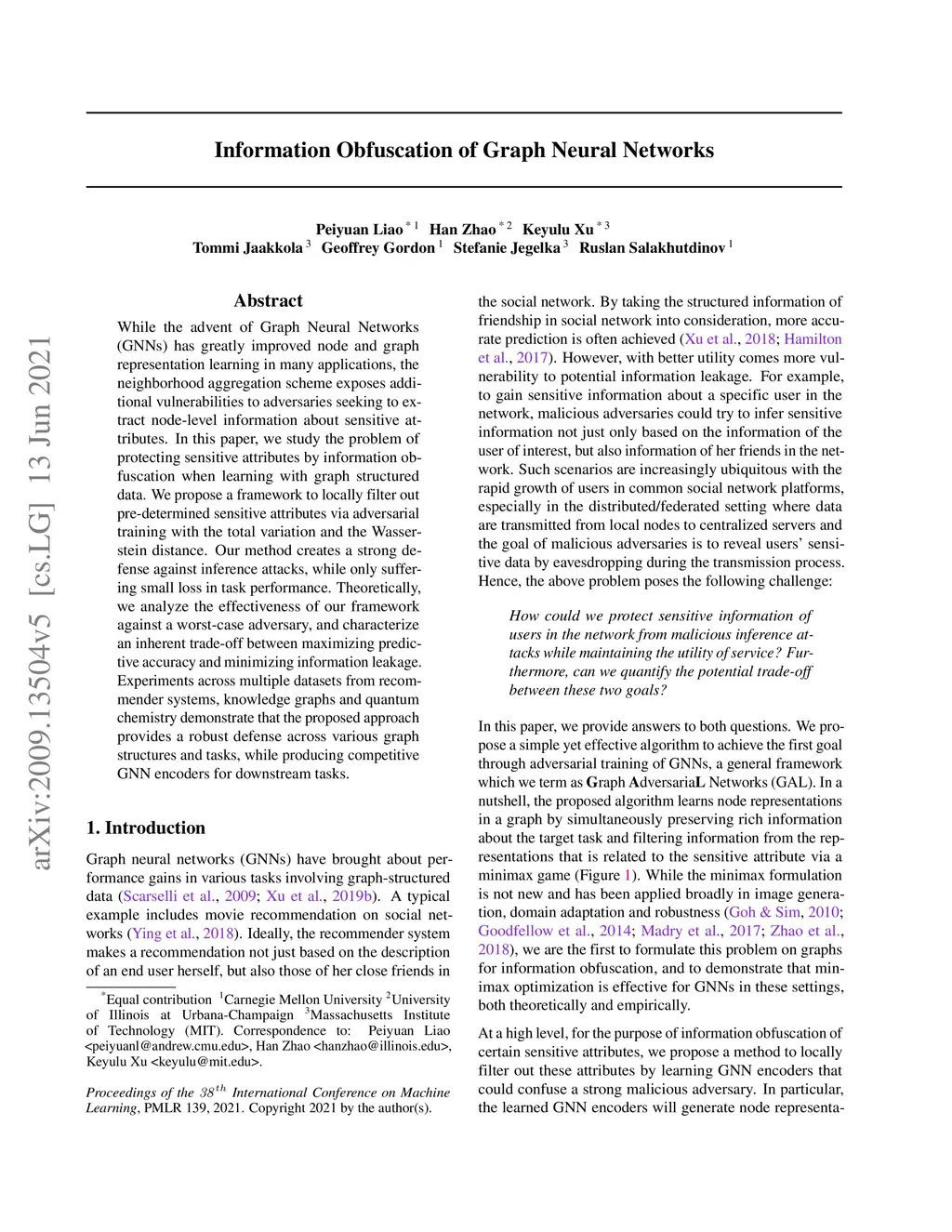While the advent of Graph Neural Networks (GNNs) has greatly improved node and graph representation learning in many applications, the neighborhood aggregation scheme exposes additional vulnerabilities to adversaries seeking to extract node-level information about sensitive attributes. In this paper, we study the problem of protecting sensitive attributes by information obfuscation when learning with graph structured data. We propose a framework to locally filter out pre-determined sensitive attributes via adversarial training with the total variation and the Wasserstein distance. Our method creates a strong defense against inference attacks, while only suffering small loss in task performance. Theoretically, we analyze the effectiveness of our framework against a worst-case adversary, and characterize an inherent trade-off between maximizing predictive accuracy and minimizing information leakage. Experiments across multiple datasets from recommender systems, knowledge graphs and quantum chemistry demonstrate that the proposed approach provides a robust defense across various graph structures and tasks, while producing competitive GNN encoders for downstream tasks.
