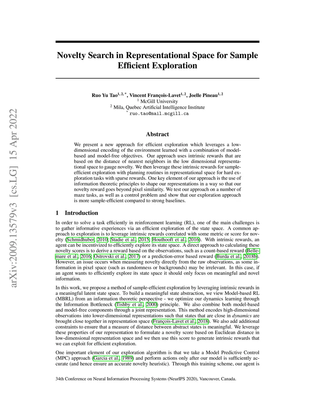 We present a new approach for efficient exploration which leverages a low-dimensional encoding of the environment learned with a combination of model-based and model-free objectives. Our approach uses intrinsic rewards that are based on the distance of nearest neighbors in the low dimensional representational space to gauge novelty. We then leverage these intrinsic rewards for sample-efficient exploration with planning routines in representational space for hard exploration tasks with sparse rewards. One key element of our approach is the use of information theoretic principles to shape our representations in a way so that our novelty reward goes beyond pixel similarity. We test our approach on a number of maze tasks, as well as a control problem and show that our exploration approach is more sample-efficient compared to strong baselines.