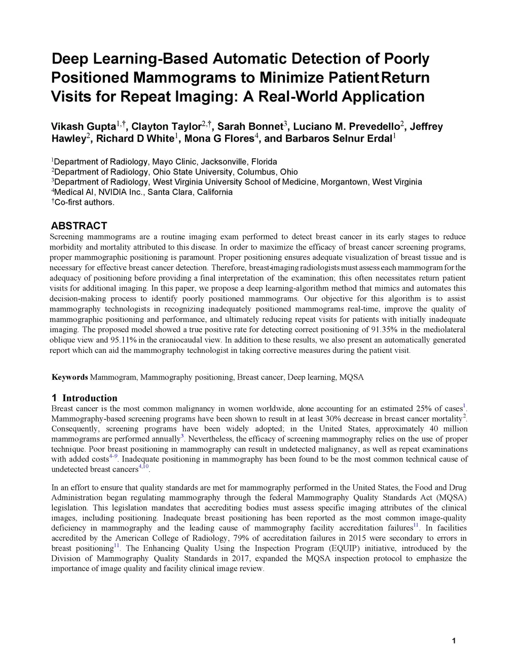 Deep Learning-Based Automatic Detection of Poorly Positioned Mammograms