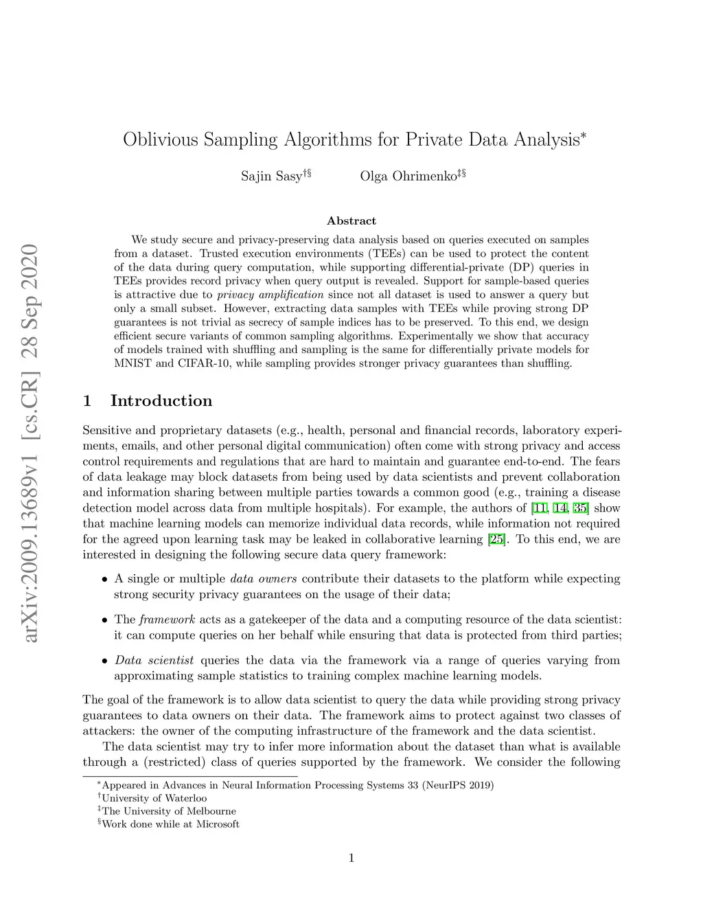 We study secure and privacy-preserving data analysis based on queries executed on samples from a dataset. Trusted execution environments (TEEs) can be used to protect the content of the data during query computation, while supporting differential-private (DP) queries in TEEs provides record privacy when query output is revealed. Support for sample-based queries is attractive due to \emph{privacy amplification} since not all dataset is used to answer a query but only a small subset. However, extracting data samples with TEEs while proving strong DP guarantees is not trivial as secrecy of sample indices has to be preserved. To this end, we design efficient secure variants of common sampling algorithms. Experimentally we show that accuracy of models trained with shuffling and sampling is the same for differentially private models for MNIST and CIFAR-10, while sampling provides stronger privacy guarantees than shuffling.