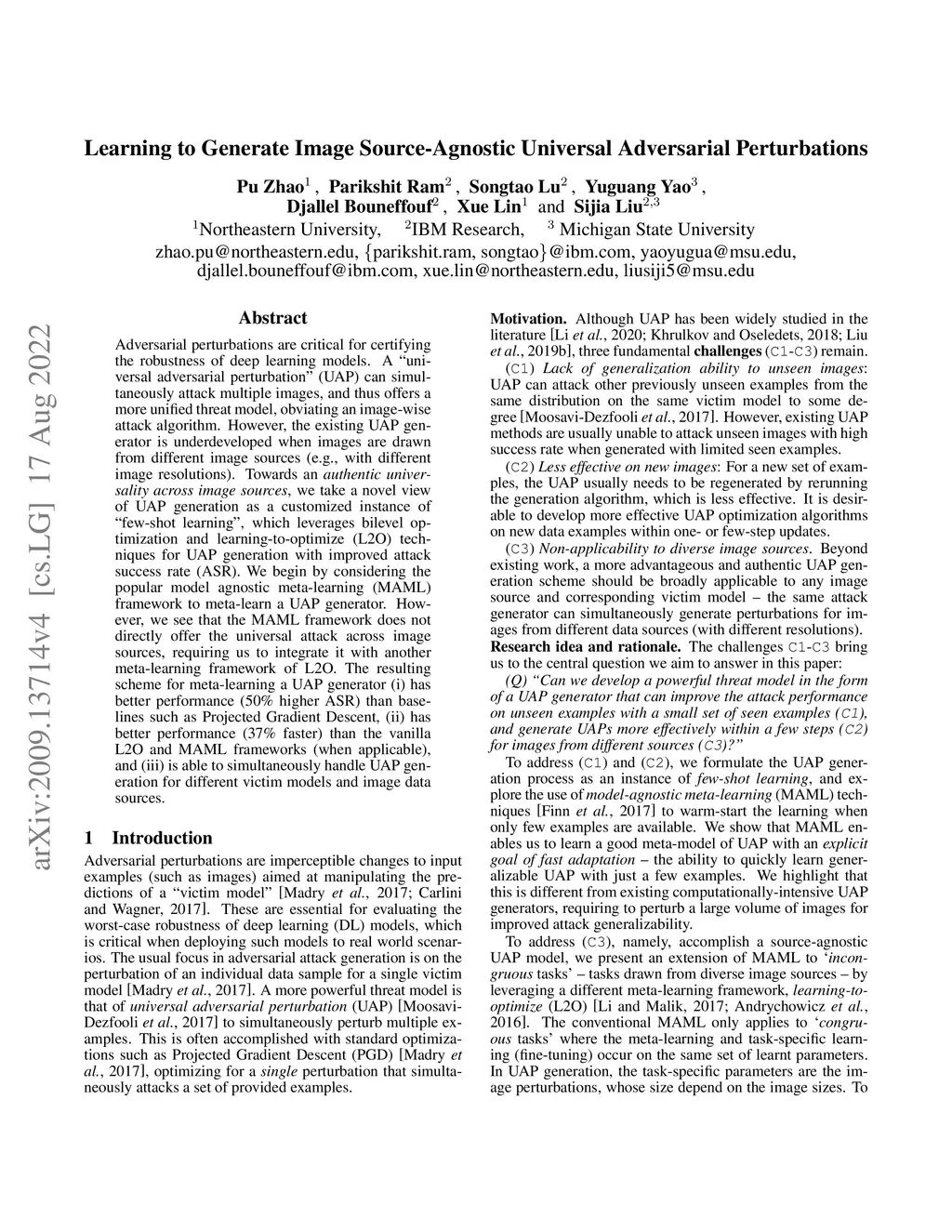 Adversarial perturbations are critical for certifying the robustness of deep learning models. A universal adversarial perturbation (UAP) can simultaneously attack multiple images, and thus offers a more unified threat model, obviating an image-wise attack algorithm. However, the existing UAP generator is underdeveloped when images are drawn from different image sources (e.g., with different image resolutions). Towards an authentic universality across image sources, we take a novel view of UAP generation as a customized instance of few-shot learning, which leverages bilevel optimization and learning-to-optimize (L2O) techniques for UAP generation with improved attack success rate (ASR). We begin by considering the popular model agnostic meta-learning (MAML) framework to meta-learn a UAP generator. However, we see that the MAML framework does not directly offer the universal attack across image sources, requiring us to integrate it with another meta-learning framework of L2O. The resulting scheme for meta-learning a UAP generator (i) has better performance (50% higher ASR) than baselines such as Projected Gradient Descent, (ii) has better performance (37% faster) than the vanilla L2O and MAML frameworks (when applicable), and (iii) is able to simultaneously handle UAP generation for different victim models and image data sources.